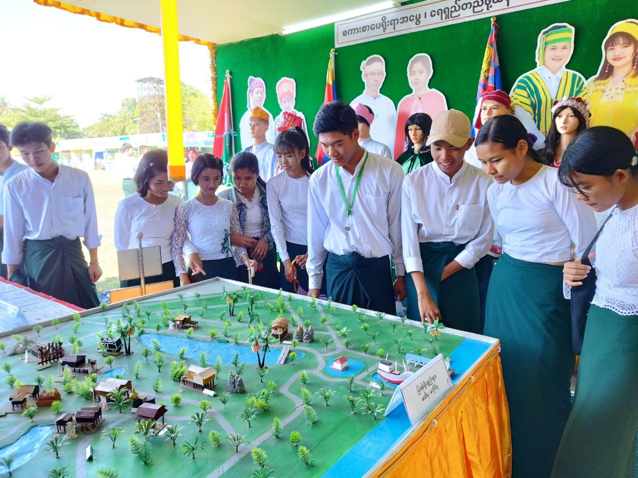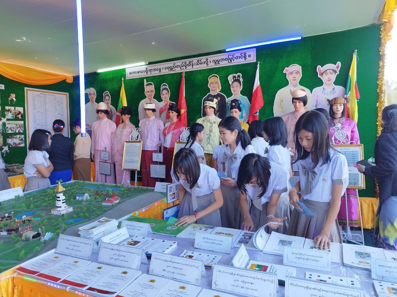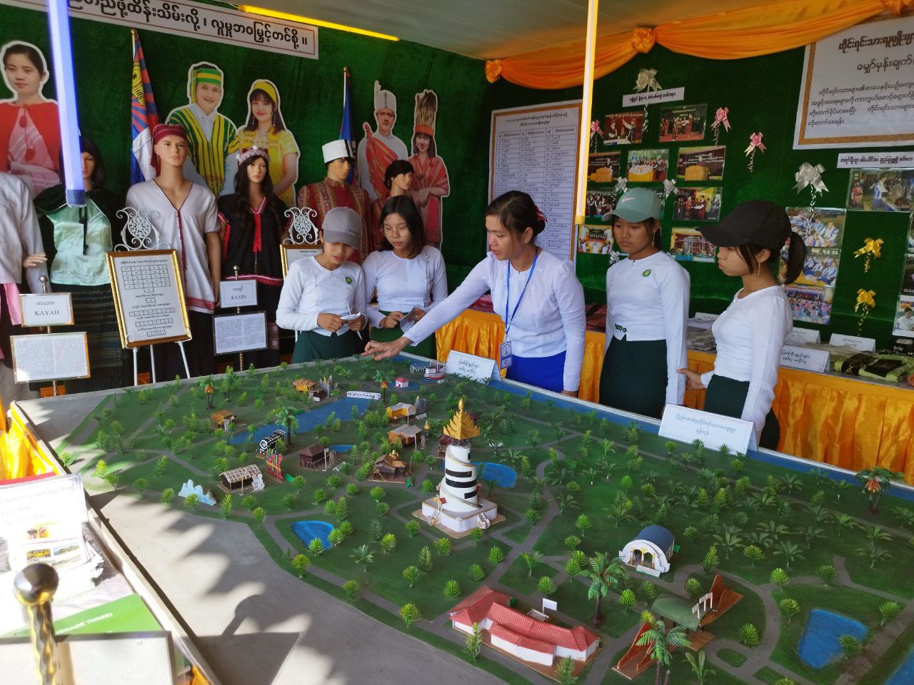 တိုင်းရင်းသားလူမျိုးများရေးရာဝန်ကြီးဌာနပြခန်းတွင် တိုင်းရင်းသားမျိုးနွယ်စုများကို ကိုယ်စား ပြုသည့် ကချင်၊ ကယား၊ ကရင်၊ ချင်း၊ ဗမာ၊ မွန်၊ ရခိုင်၊ ရှမ်း မျိုးနွယ်စုကြီး(၈)မျိုး၏ ရိုးရာ ဝတ်စားဆင်ယင်ထုံးဖွဲ့မှုနှင့် အဆိုပါမျိုးနွယ်စုများ၏ အခြေခံစာပေ (ဗျည်း၊ သရ)များအား ပြသခြင်း၊ တိုင်းရင်းသားမျိုးနွယ်စု ကိုယ်စားပြုအလံများ၊ ပြည်ထောင်စုတိုင်းရင်းသားကျေးရွာ(ရန်ကုန်) ပုံစံငယ် အားပြသခြင်း၊ တိုင်းရင်းသားများ၏ နေ့ထူးနေ့မြတ်အခမ်းအနား ဆောင်ရွက်မှုမှတ်တမ်းဓါတ်ပုံများ၊ ဝန်ကြီးဌာန၏ မျှော်မှန်းချက်(Vision) နှင့် ဦးစီးဌာန၏ ဆောင်ပုဒ်များ၊ မြန်မာနိုင်ငံရှိ တိုင်းရင်းသား မျိုးနွယ်စု (၁၃၅) မျိုးစာရင်းများ၊ တိုင်းဒေသကြီး နှင့် ပြည်နယ်အတွင်း တိုင်းရင်းသားဘာသာစာပေ သင်ကြားခွင့်ရရှိသည့် ဘာသာစာပေ(၇၂)မျိုးစာရင်းများ၊ တိုင်းရင်းသားလူမျိုးများ၏ အခွင့်အရေး ကာကွယ်စောင့်ရှောက်သည့် ဥပဒေ၊ နည်းဥပဒေ ဘာသာပြန်စာအုပ်များ၊ ဧရာဝတီတိုင်းဒေသကြီး အတွင်း သင်ကြားခွင့်ရရှိသည့် ပိုးကရင်၊ စကောကရင်၊ ရခိုင် နှင့် အရှိုချင်းတိုင်းရင်းသားဘာသာ ကျောင်းသုံးပုံနှိပ်စာအုပ်များ၊ တိုင်းရင်းသားလူမျိုးများ၏ နေ့ထူးနေ့မြတ် အကြောင်းအရာစာအုပ်များ၊ ပုံပြင်စာအုပ်များ၊ စကားထာစာအုပ်များ၊ စကားပုံ/ဆိုရိုးစာအုပ်များ နှင့် တိုင်းရင်းသားရိုးရာဝတ်စုံ များအား ခင်းကျင်းပြသဆောင်ရွက်ခဲ့ပြီး တိုင်းရင်းသားမျိုးနွယ်စုများအကြောင်းပါဝင်သည့် လက်ကမ်း စာစောင်များအား ဖြန့်ဝေပေးခဲ့ပါသည်။