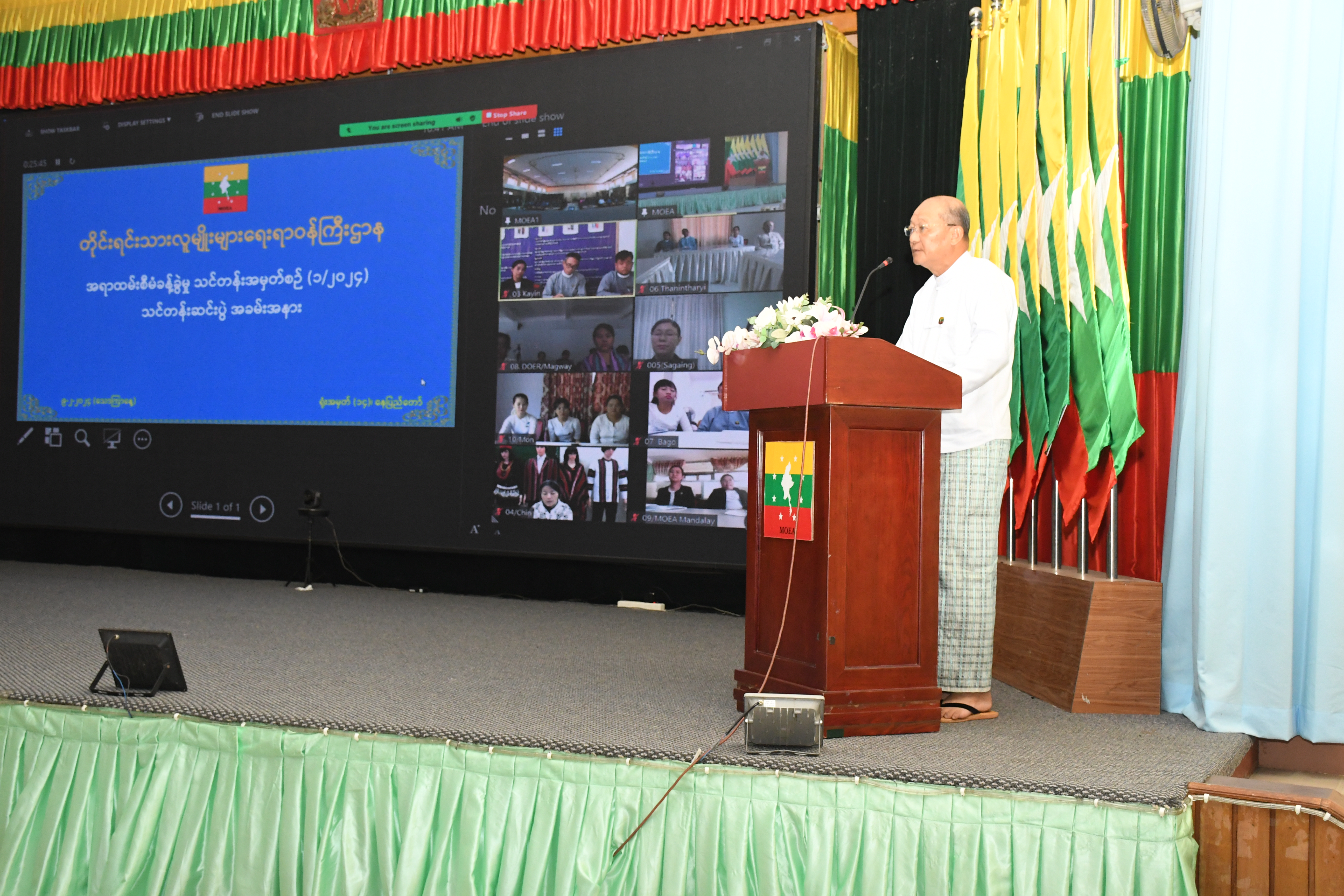 ရှေးဦးစွာ ပြည်ထောင်စုဝန်ကြီးက အဖွင့်အမှာစကားပြောကြားရာတွင် အရာထမ်း စီမံခန့်ခွဲမှုသင်တန်း အမှတ်စဉ်(၁/၂၀၂၄) ကို သင်တန်းသား (၅၇) ဦးဖြင့် ဖွင့်လှစ်နိုင်ခဲ့ပြီး ဤသင်တန်းဖြစ်မြောက်ရေးအတွက် အဘက်ဘက်မှ ပါဝင်ပံ့ပိုးခဲ့ကြသော တာဝန်ရှိပုဂ္ဂိုလ်များကို ကျေးဇူးတင်ရှိပါကြောင်း၊ နိုင်ငံ့ဝန်ထမ်းများ၊ ဌာနဆိုင်ရာတာဝန်ရှိသူများသည် နိုင်ငံတော်အစိုးရကိုယ်စား တာဝန်ထမ်းဆောင်နေကြသူများဖြစ်ပါကြောင်း၊ အစိုးရနှင့် ပြည်သူများအကြား ပေါင်းကူးဆက်စပ်ပေးသည့် လူပုဂ္ဂိုလ်များ၊ ဌာနများဖြစ်ပါကြောင်း၊ တစ်နည်းအားဖြင့် နိုင်ငံသူ၊ နိုင်ငံသားများ၏ အကျိုးစီးပွားကို မှန်ကန်သစ္စာရှိစွာ ဖော်ဆောင်ပေးသူများဖြစ်ပါကြောင်း၊ သင်တန်းသူ သင်တန်းသားများအနေဖြင့် မိမိတို့၏ ဌာနဆိုင်ရာလုပ်ငန်းတာဝန်များနှင့် ပတ်သက်၍ အတွေ့အကြုံရှိပြီး အရည်အသွေးနှင့် အရည်အချင်းပြည့်ဝကာ လုပ်ငန်းစွမ်းဆောင်ရည်မြင့်မားပြီး ကျွမ်းကျင်သူပညာရှင်များ ဖြစ်လာရန်လိုအပ်ပါကြောင်း၊ မိမိတို့ တာဝန်ထမ်းဆောင်နေသည့် နေရာဒေသနှင့် တိုင်းဒေသကြီး/ ပြည်နယ် ဖွံ့ဖြိုးတိုးတက်ရေး အတွက် အားကောင်းလာစေရန် ကျရာအခန်းကဏ္ဍမှ ဝိုင်းဝန်းဆောင်ရွက်ပေးကြရမည်ဖြစ်ပါကြောင်း၊ ဤသင်တန်း တက်ရောက်သင်ကြားခဲ့ခြင်းအားဖြင့် မိမိတို့ဌာန၏ မူဝါဒ၊ လုပ်ငန်းစဉ်၊ စည်းမျဉ်းစည်းကမ်း၊ ဥပဒေလုပ်ထုံးလုပ်နည်းများကို စနစ်တကျ သိရှိထားမှသာ လုပ်ငန်းများဆောင်ရွက်ရာတွင်ဖြစ်စေ၊ ပြည်သူများကို ဝန်ဆောင်မှုပေးရာတွင်ဖြစ်စေ၊ ပြည်သူတို့၏ ရပိုင်ခွင့် အခွင့်အလမ်းများကို အထောက်အကူပြုပေးရာတွင်ဖြစ်စေ ထိရောက်စွာ ဆောင်ရွက်လာနိုင်မည်ဖြစ်ပါကြောင်း၊ နိုင်ငံတော်နှင့်ဝန်ကြီးဌာနအတွက် အားကိုးအားထား ပြုရမည့် ဝန်ထမ်းကောင်းများ ဖြစ်လာစေရန် စဉ်ဆက်မပြတ် အမြဲကြိုးစားရန် လိုအပ်ပါကြောင်း၊ ဝန်ထမ်းများအနေဖြင့် အဖွဲ့အစည်းနှင့် ဆောင်ရွက်ရသည်ဖြစ်ရာ အဖွဲ့အစည်းအတွင်း တာဝန်ခွဲဝေယူတတ်ခြင်း၊ စည်းလုံးညီညွတ်စွာ ပူးပေါင်းဆောင်ရွက်တတ်ခြင်း၊ တာဝန်ယူခြင်း၊ တာဝန်ခံခြင်းစသည့် စိတ်ဓာတ်များရှိနေရန် လိုအပ်ပါကြောင်း၊ ရဲဘော်ရဲဘက်စိတ်ဓာတ် ရှိရမည်ဖြစ်ပြီး သို့မှသာ ဝန်ကြီးဌာန၏ မျှော်မှန်းချက်၊ ရည်မှန်းချက်များကို ရာနှုန်းပြည့်နီးပါး အကောင်အထည်ဖော် ဆောင်ရွက်နိုင်မည်ဖြစ်ပါကြောင်း၊ မိမိတို့ဝန်ကြီးဌာနအနေဖြင့် တိုင်းရင်းသားစည်းလုံးညီညွတ်ရေးကို အဓိကထား၍ ကြိုးပမ်းဆောင်ရွက်ရန် လိုအပ်ပြီး ဝန်ထမ်းများအနေဖြင့် စံနမူနာပြဖြစ်အောင် ကြိုးစားနေထိုင်သွားကြရန်ဖြစ်ပါကြောင်း၊ သင်တန်းသားများအနေဖြင့် သင်တန်းတွင် သင်ကြားပို့ချခဲ့သည့် သင်ခန်းစာများ၊ ဌာနနှင့်ပတ်သက်သည့် စည်