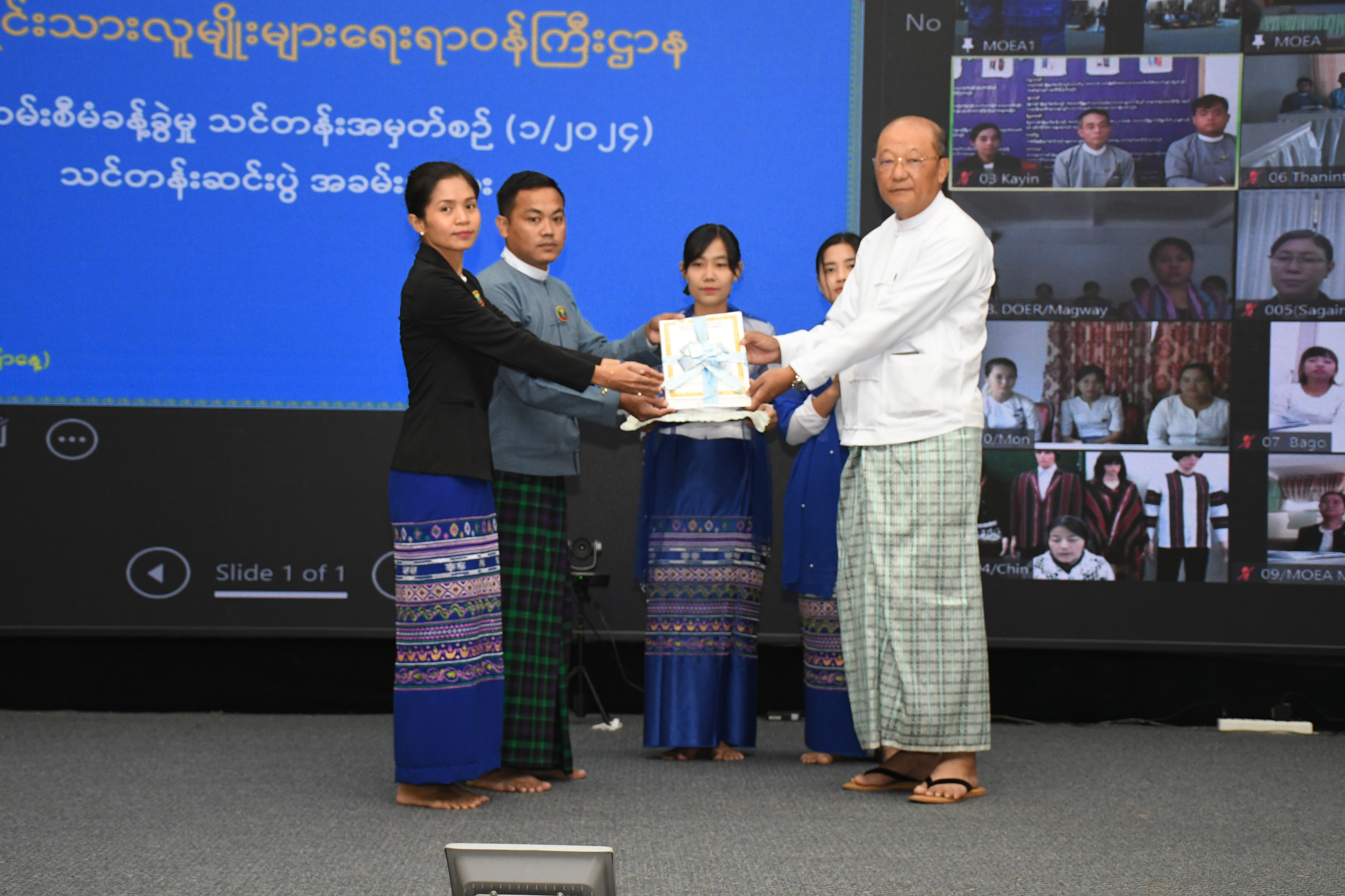 ဆက်လက်၍ ပြည်ထောင်စုဝန်ကြီးက သင်တန်းဆင်းလက်မှတ်များကို ပေးအပ်ရာ သင်တန်းသားများကိုယ်စား သင်တန်းသား(၁)ဦးကလည်းကောင်း၊ သင်တန်းသူများကိုယ်စား သင်တန်းသူ (၁) ဦးကလည်းကောင်း လက်ခံရယူကြပါသည်။