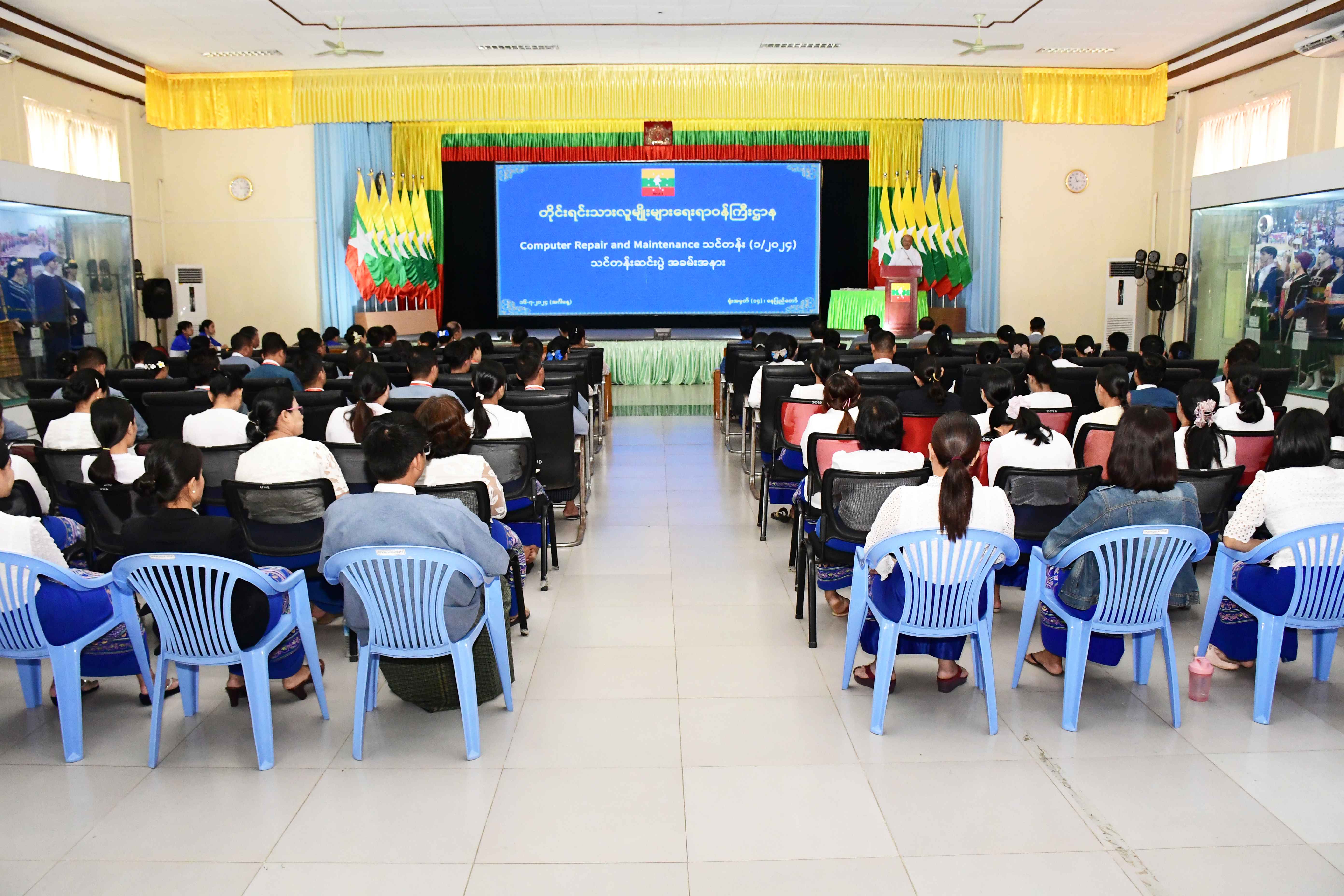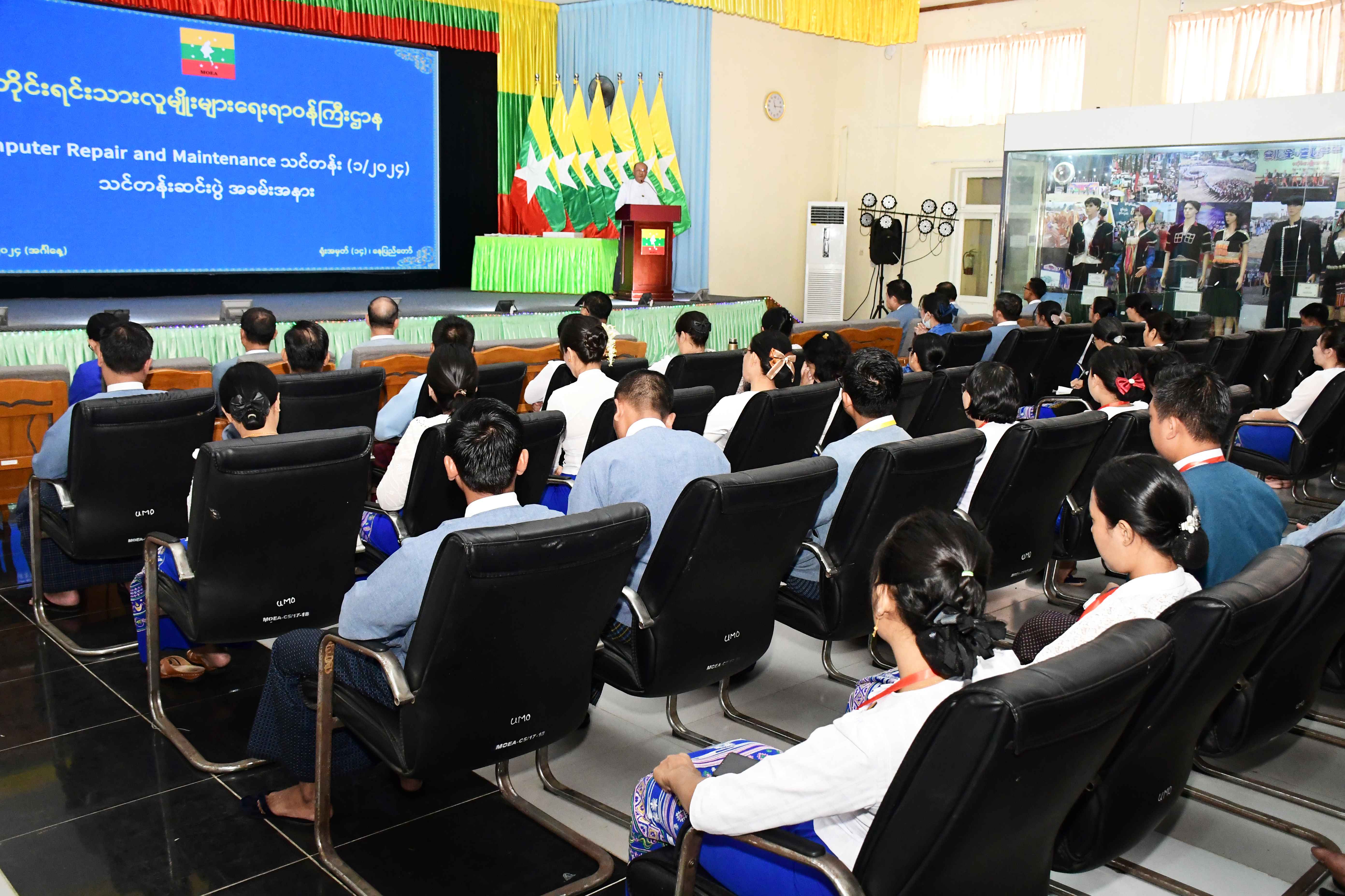 ယင်းနောက် ဒုတိယဝန်ကြီးက ယနေ့ IT (Information Technology) ခေတ်တွင် နည်းပညာများ တိုးတက်ထွန်းကားလာနှင့်အညီ ကွန်ပျူတာသည် ရုံးလုပ်ငန်းများတွင်သာမက ပြင်ပစီးပွားရေး လုပ်ငန်းများအတွက်ပါ မရှိမဖြစ် အသုံးဝင်လာသဖြင့် ကွန်ပျူတာနှင့်ဆက်စပ် သည့် နည်းပညာများကို သိရှိတတ်ကျွမ်း နားလည်ရုံမျှသာမက စနစ်တကျ ပြုပြင်ထိန်းသိမ်း တတ်ရန်လည်း အထူးပင်လိုအပ်လှပါကြောင်း၊ ယခုသင်တန်းမှ မိမိတို့လေ့လာသင်ယူခဲ့ရသည့် ကွန်ပျူတာ ပြုပြင်ထိန်းသိမ်းခြင်းဆိုင်ရာ ပညာရပ်များကို တာဝန်ကျရာဒေသများရှိ လုပ်ဖော် ကိုင်ဖက်များအား ပြန်လည်မျှဝေ သင်ကြားပေးခြင်းဖြင့် မိမိတို့ကိုယ်တိုင်လည်း ပိုမိုနားလည်သိရှိ နိုင်မည်ဖြစ်ပါကြောင်း၊ ဝန်ထမ်းများအနေဖြင့် နိုင်ငံတော်စီမံအုပ်ချုပ်ရေးကောင်စီမှ ချမှတ်ထားသည့် ရှေ့လုပ်ငန်းစဉ် (၅)ရပ်၊ ဦးတည်ချက်(၉)ရပ်၊ နိုင်ငံ့ဝန်ထမ်းဥပဒေ၊ နည်းဥပဒေများနှင့်အညီ စစ်မှန်သောပြည်ထောင်စုစိတ်ဓာတ်နှင့် မျိုးချစ်စိတ်ဓာတ်တို့ဖြင့် မိမိတို့၏ တာဝန်ဝတ္တရားများကို ကျေပွန်စွာ ထမ်းဆောင်နိုင်ကြပါစေကြောင်း ပြောကြားပါသည်။