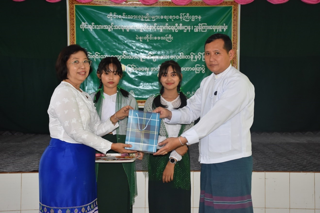 ဆက်လက်၍ တိုင်းရင်းသားရေးရာဝန်ကြီး ဦးစောလင်းအောင်က ဟောပြောပို့ချပေးသော ဌာနဆိုင်ရာများမှ တာဝန်ရှိသူများအား အမှတ်တရလက်ဆောင်များ ပေးအပ်ခဲ့ပြီး တိုင်းရင်းသား အခွင့်အရေးများကာကွယ်စောင့်ရှောက်ရေးဦးစီးဌာန၊ ပဲခူးတိုင်းဒေသကြီး ညွှန်ကြားရေးမှူးရုံးမှ ညွှန်ကြားရေးမှူး ဒေါ်ခိုင်ရွှေဝါက ကျောင်းစာကြည့်တိုက်အတွက် အလှူငွေ ကျပ်တစ်သိန်းငါးသောင်းတိတိအား အ.လ.က(ညောင်အင်း) ကျောင်းအုပ်ဆရာမကြီးထံ ပေးအပ်လှူဒါန်းခဲ့ပါသည်။
