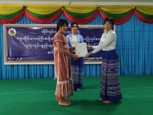 အခမ်းအနားတွင် တိုင်းရင်းသားအခွင့်အရေးများကာကွယ်စောင့်ရှောက်ရေးဦးစီးဌာန၊ ပဲခူးတိုင်းဒေသကြီး ညွှန်ကြားရေးမှူးရုံးမှ လက်ထောက်ညွှန်ကြားရေးမှူး ဒေါ်ဆုသီရိအေးက သင်တန်းဆင်းအမှာစကား ပြောကြားခဲ့ပြီး အလုပ်သမားညွှန်ကြားရေးဦးစီးဌာန၊ ကျွမ်းကျင်မှု လေ့ကျင့်ရေးသင်တန်း ကျောင်း(ပဲခူး)မှ ကျောင်းအုပ်ကြီး ဦးအောင်နိုင်စိုးက သင်တန်း ဖွင့်လှစ်ခြင်းနှင့်ပတ်သက်၍ ရှင်းလင်းပြောကြားခဲ့ပြီးနောက် သင်တန်းသား/သူများအား သင်တန်းဆင်းလက်မှတ်များ ပေးအပ်ခဲ့ပါသည်။