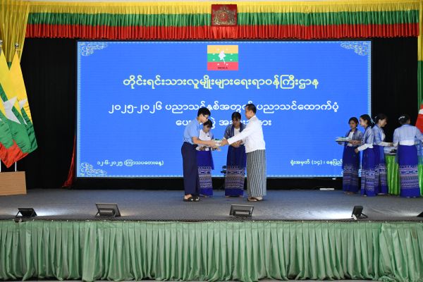 ထို့နောက် ဒုတိယဝန်ကြီးနှင့် တာဝန်ရှိသူများက ကျောင်းသား၊ ကျောင်းသူများအား ပညာသင်ထောက်ပံ့ငွေနှင့် စာရေးကိရိယာပစ္စည်းများ အသီးသီး ပေးအပ်ကာ အခမ်းအနားကို ရုပ်သိမ်းခဲ့ပါသည်။