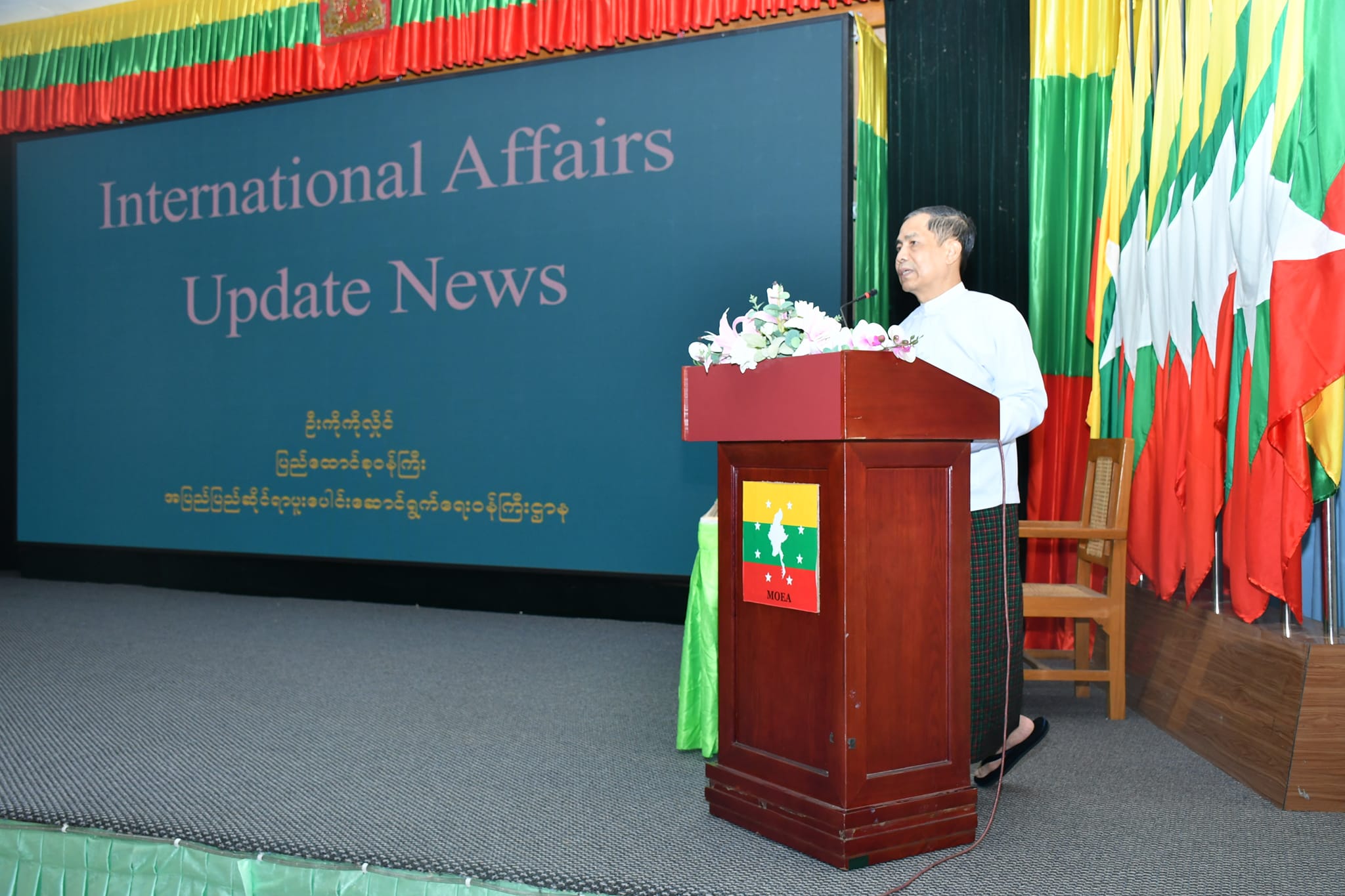 ထို့နောက် အပြည်ပြည်ဆိုင်ရာပူးပေါင်းဆောင်ရွက်ရေးဝန်ကြီးဌာန ပြည်ထောင်စုဝန်ကြီး ဦးကိုကိုလှိုင်က International Affairs Update News ခေါင်းစဉ်ဖြင့် မျက်မှောက် ကမ္ဘာ့နိုင်ငံရေး အခြေအနေများကိုလည်းကောင်း၊ ပြည့်အင်အားသည် ပြည်တွင်းမှာသာရှိသည်ဟူသော စကား နှင့်အညီ တိုင်းရင်းသားစည်းလုံးညီညွတ်မှု ပိုမိုအားကောင်းလာစေရန် ဆောင်ရွက်သင့်သည့် အချက်များကိုလည်းကောင်း ဟောပြောဆွေးနွေးခဲ့ပါသည်။