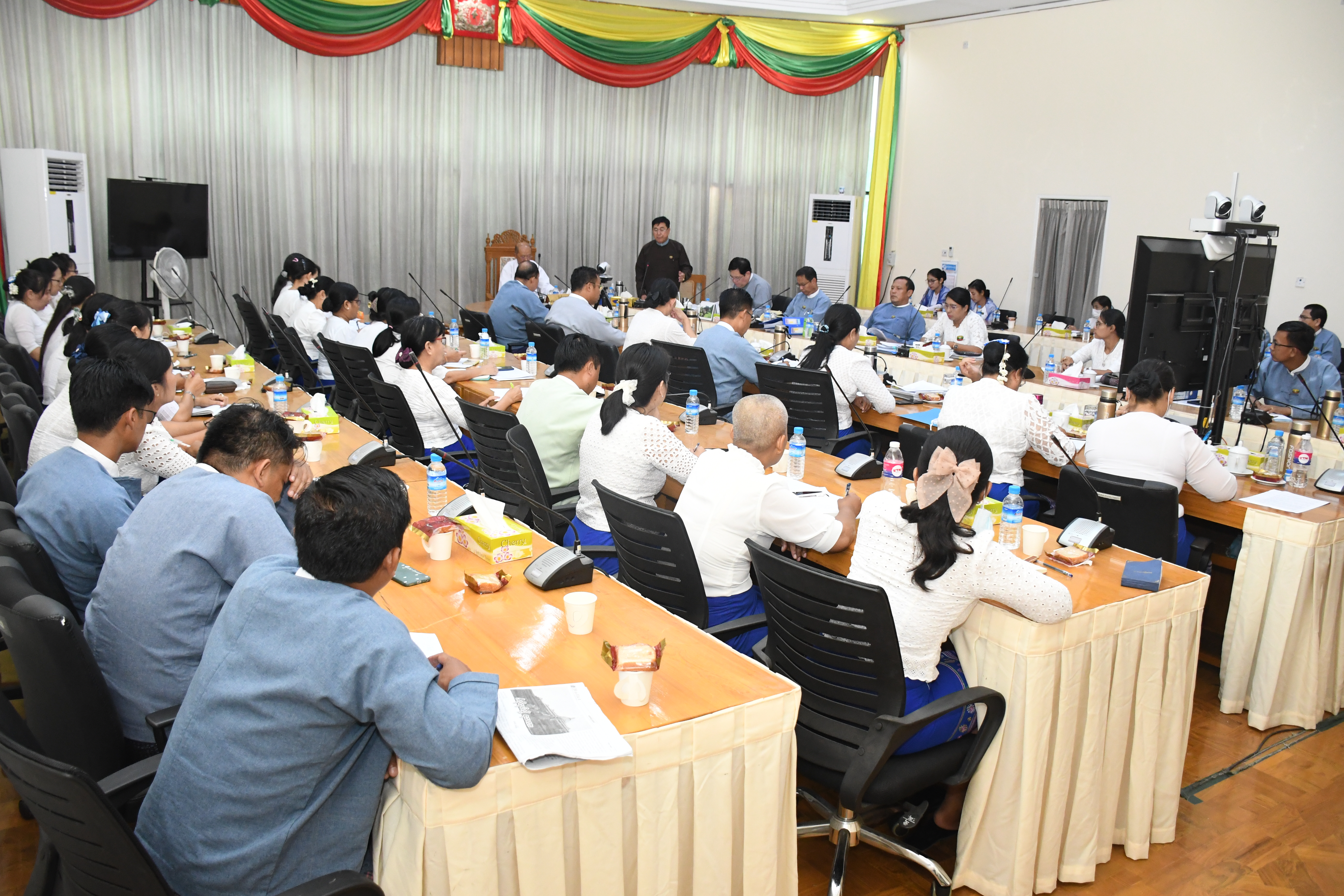 ဦးစွာ ပြည်ထောင်စုဝန်ကြီးက အဖွင့်အမှာစကားပြောကြားရာတွင် ၂၀၂၃-၂၀၂၄ ဘဏ္ဍာရေးနှစ် အမျိုးသားစီမံကိန်းဥပဒေကို တိုင်းပြည်သာယာဝပြောရေးနှင့် စားရေရိက္ခာဖူလုံရေးတို့အတွက် ပြည်သူ့လူမှုစီးပွားဘဝ ဖွံ့ဖြိုးတိုးတက်ရန်နှင့် ပြည်သူကို ဗဟိုပြု၍ အားလုံးပါဝင်နိုင်သော ရေရှည်ဖွံ့ဖြိုးတိုးတက်မှု ရရှိစေရန် ရည်ရွယ်၍ ချမှတ်ထားသည့် နိုင်ငံတော်၏ ရှေ့လုပ်ငန်းစဉ် ၅ ရပ်၊ ဦးတည်ချက် ၁၂ ရပ် နှင့်အညီ စနစ်တကျအကောင်အထည် ဖော်နိုင်ရန်အလို့ငှာ နိုင်ငံတော် စီမံအုပ်ချုပ်ရေးကောင်စီသည် ပြည်ထောင်စုသမ္မတမြန်မာနိုင်ငံတော် ဖွဲ့စည်းပုံအခြေခံဥပဒေ ပုဒ်မ ၄၁၉ အရ ပြဌာန်းခြင်းဖြစ်ပါကြောင်း၊ အမျိုးသားစီမံကိန်းဆိုသည်မှာ တစ်မျိုးသားလုံး၏ လူမှုစီးပွားရေးတစ်ရပ်လုံးအတွက်ဖြစ်စေ၊ သတ်မှတ်ထားသည့် အချိန်ကာလအတွင်း မည်၍ မည်မျှ တိုးတက်ရမည်ဆိုသည့် နိုင်ငံတော်၏ ရည်မှန်းချက်များနှင့် လုပ်ငန်းအစီအစဉ်များ ဖြစ်ပါကြောင်း၊ “ရှေ့သို့ချီမည် ပန်းတိုင်ဆီ” ဟူသည့် နိုင်ငံတော်အကြီးအကဲ၏ လမ်းညွှန်ချက် နှင့်အညီ မိမိတို့ဝန်ကြီးဌာနအနေဖြင့် အစွမ်းကုန် အားထည့်၍ လက်တွေ့ကျကျ အကောင်အထည်ဖော် ဆောင်ရွက်ကြရန်ဖြစ်ပါကြောင်း၊ ၂၀၂၃-၂၀၂၄ ဘဏ္ဍာရေးနှစ်အတွက် မိမိတို့ဝန်ကြီးဌာနမှ စီမံကိန်းလုပ်ငန်းစဉ် (၂၄) ခု တင်ပြခဲ့ပြီး ရငွေအနေဖြင့် (၁၀၇၀.၅၇၈) သန်း နှင့်သုံးငွေအနေဖြင့် (၅၄၁၃.၇၀၉) သန်း ကို နိုင်ငံတော်မှ အတည်ပြုပေးခဲ့ပြီးဖြစ်ပါကြောင်း၊ ၂၀၂၃ ခုနှစ်၊ ဧပြီလ ၃ ရက်နေ့တွင် နိုင်ငံတော်စီမံအုပ်ချုပ်ရေး ကောင်စီဥက္ကဋ္ဌ ကိုယ်တိုင် လက်မှတ်ရေးထိုးပြီး ဘဏ္ဍာရေးဆိုင်ရာ အရအသုံးများကို လုပ်ပိုင်ခွင့်အပ်နှင်းပေးခဲ့ပြီး ပြည်ထောင်စုဝန်ကြီးကိုယ်တိုင် စီမံကြည့်ရှုကွပ်ကဲရန်၊ ရရှိလာသည့် ဘဏ္ဍာငွေများကို ဘဏ္ဍာရေး ဆိုင်ရာ စည်းမျဉ်း၊ စည်းကမ်းများ၊ လုပ်ထုံးလုပ်နည်းများ၊ အမိန့်နှင့်ညွှန်ကြားချက်များနှင့်အညီ သုံးစွဲရန်၊ (၃) လတစ်ကြိမ် စနစ်တကျ ပြန်လည်အစီရင်ခံ တင်ပြရန် လမ်းညွှန်ထားပါကြောင်း၊ သို့ဖြစ်ရာ သက်ဆိုင်ရာဌာနများအလိုက် ငွေကြေးကိစ္စရပ်များကို လွှဲအပ်ပေးပြီးဖြစ်ပါကြောင်း၊ အထူးသဖြင့် ရငွေများကို ပိုမိုရှာဖွေရန်ဖြစ်ပြီး သုံးငွေများကို ချွေတာသုံးစွဲရန်ဖြစ်ပါကြောင်း၊ ရုံးလုပ်ငန်းဆောင်ရွက်ရာတွင် ပင်မအဖွဲ့အစည်းနှင့် အထောက်အကူပြု အဖွဲ့အစည်းဟူ၍ ရှိပါကြောင်း၊ အဆိုပါစီမံကိန်းများ အကောင်အထည်ဖော် ဆောင်ရွက်နိုင်ရေးအတွက် လူ့စွမ်းအားအရင်းအမြစ်၊ ဘဏ္ဍာငွေ၊ လုပ်ငန်းစွမ်းဆောင်နိုင်မှုအင်အားနှင့် အချိန်ကာလတို့ကို စနစ်တကျအသုံးချပြီး အချင်းချင်း အပြန်အလှန် တိုင်တိုင်ပင်ပင် ပူးပေါင်းဆောင်ရွက်သွားမည် ဆိုပါက အခက်အခဲမရ