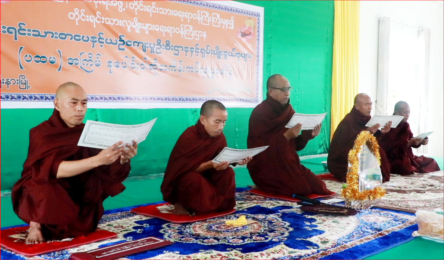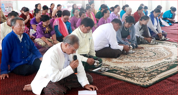 ရှေးဦးစွာ အခမ်းအနားကို စိန္တာမဏိလိုရာပြည့်ကျောင်းတိုက် ပဓာနနာယက ဆရာတော် ဘဒ္ဒန္တ စိန္တိတ အမှူးပြုသော ဆရာတော်၊ သံဃာတော်များအား ကချင်ပြည်နယ်အစိုးရအဖွဲ့ဝင် တိုင်းရင်းသား ရေးရာဝန်ကြီး ဦးကျော်မင်းခိုင်နှင့် ဇနီး ၊ ဦးစီးဌာနမှ အရာထမ်း၊ အမှုထမ်းများနှင့် ရှမ်းမျိုးနွယ်စုများ (တိုင်းလိုင်၊ တိုင်းလေ၊ တိုင်းခမ်းတီ၊ တိုင်းဆာနှင့် တိုင်းလုံ) မှ တာဝန်ရှိသူများက နမောတဿ (၃)ကြိမ် ရွတ်ဆိုဘုရားကန်တော့ဖွင့်လှစ်ခဲ့ကြပြီး ဆရာတော်ထံမှ ငါးပါးသီလခံယူ ဆောက်တည်ကြကာ ပရိတ် တရားတော်များကို နာယူခဲ့ကြပါသည်။