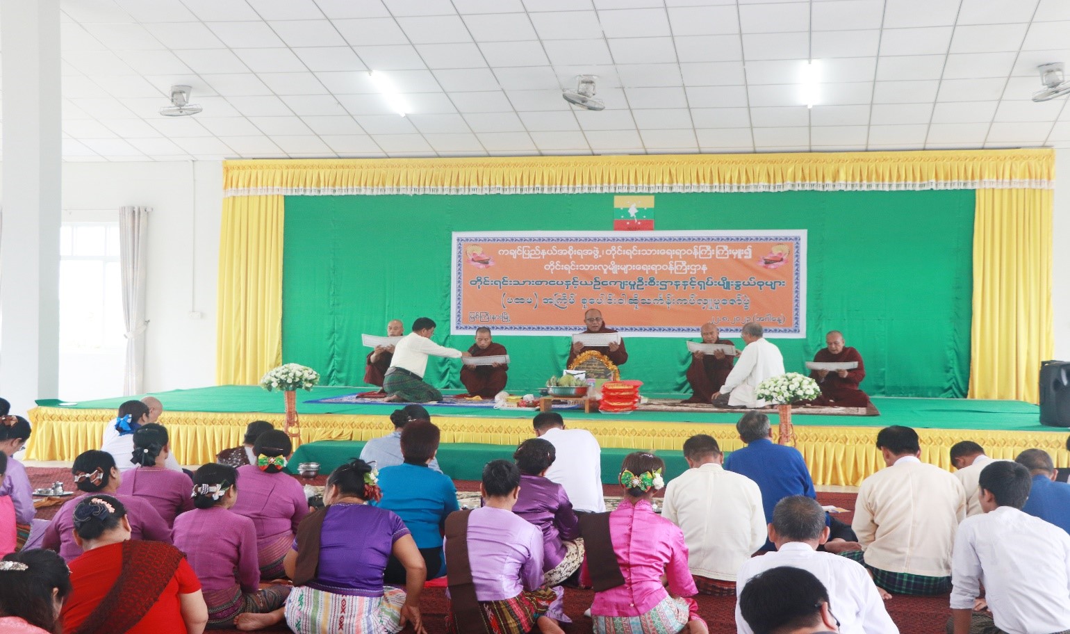 ကချင်ပြည်နယ်အစိုးရအဖွဲ့ တိုင်းရင်းသားရေးရာဝန်ကြီး ကြီးမှူး၍ တိုင်းရင်းသားလူမျိုးများရေးရာ ဝန်ကြီးဌာန၊တိုင်းရင်းသားစာပေနှင့်ယဉ်ကျေးမှုဦးစီးဌာနနှင့်ရှမ်းမျိုးနွယ်စုများ (တိုင်းလိုင်၊ တိုင်းလေ၊ တိုင်းခမ်းတီ၊ တိုင်းဆာနှင့် တိုင်းလုံ)၏ ပထမအကြိမ် စုပေါင်းဝါဆိုသင်္ကန်း ဆက်ကပ် လှူဒါန်းပွဲ အခမ်းအနားကို သြဂုတ် (၂၂) ရက် နံနက်ပိုင်းက မန်ခိန်ရပ်ကွက်၊ တိုင်းရင်းသားလူမျိုးများရေးရာ ဝန်ကြီးဌာန၊ ညွှန်ကြားရေးမှူးရုံး၊ အစည်းအဝေးခန်းမ၌ ကျင်းပပြုလုပ်ခဲ့ပါသည်။