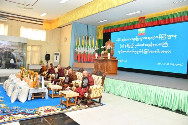 “တိုင်းရင်းသားလူမျိုးများရေးရာဝန်ကြီးဌာန၏ (၇)နှစ်ပြည့် နှစ်ပတ်လည်နေ့အကြို ဆွမ်းဆက်ကပ်လှူဒါန်းခြင်း” အခမ်းအနားကို ယနေ့နံနက်ပိုင်းတွင် တိုင်းရင်းသားလူမျိုးများရေးရာဝန်ကြီးဌာန၊ အစည်းအဝေးခန်းမ၌ ကျင်းပပြုလုပ်ရာ ပြည်ထောင်စုဝန်ကြီး Jeng Phang နော်တောင်၊ ဒုတိယဝန်ကြီး ဦးဇော်အေးမောင်၊ ညွှန်ကြားရေးမှူးချုပ်များ၊ ဒုတိယညွှန်ကြားရေးမှူးချုပ်များနှင့် အရာထမ်းများ တက်ရောက် ကြည်ညိုခဲ့ကြပါသည်။ အခမ်းအနားကို နမောတဿ (၃)ကြိမ် ရွတ်ဆို၍ ဖွင့်လှစ်ခဲ့ပြီး အေးမြရွှေပြည် ကျောင်းတိုက် ဆရာတော် ဦးမဉ္ဇူသက ထံမှ ဧည့်ပရိတ်သတ်များက သရဏဂုံ (၃) ပါး နှင့် တကွ (၅) ပါး သီလ ခံယူဆောက်တည်ကြပြီးနောက် ပြည်ထောင်စုဝန်ကြီး၊ ဒုတိယဝန်ကြီးနှင့် တာဝန်ရှိသူများက ဆရာတော်၊ သံဃာတော်များထံ နဝကမ္မအလှူတော် ငွေနှင့် ဆန်၊ ဆီ၊ ဆား၊ ကြက်သွန်၊ အာလူး၊ ခေါက်ဆွဲခြောက် အစရှိသော လှူဖွယ်ဝတ္တုအစုစုတို့ကို လှူဒါန်းပြီး ရေစက်သွန်းချ အမျှပေးဝေခဲ့ကြပါသည်။ ထို့နောက် ဆရာတော်များမှ ပရိတ်တရားတော်များ ရွတ်ပွား သရဇ္စျာယ် ချီးမြှင့်တော် မူကြပြီး အခမ်းအနားကို “ဗုဒ္ဓ သာသနံ စိရံ တိဋ္ဌတု” (၃)ကြိမ်ရွတ်ဆိုပြီး အခမ်းအနားကို ရုပ်သိမ်းခဲ့ပါသည်။ အခမ်းအနားအပြီးတွင် ပြည်ထောင်စုဝန်ကြီး၊ ဒုတိယဝန်ကြီးနှင့် တာဝန်ရှိသူများက ဆရာတော်၊ သံဃာတော်များအား နေ့ဆွမ်းဆက်ကပ် လှူဒါန်းခဲ့ကြောင်း သတင်းရရှိ ပါသည်။