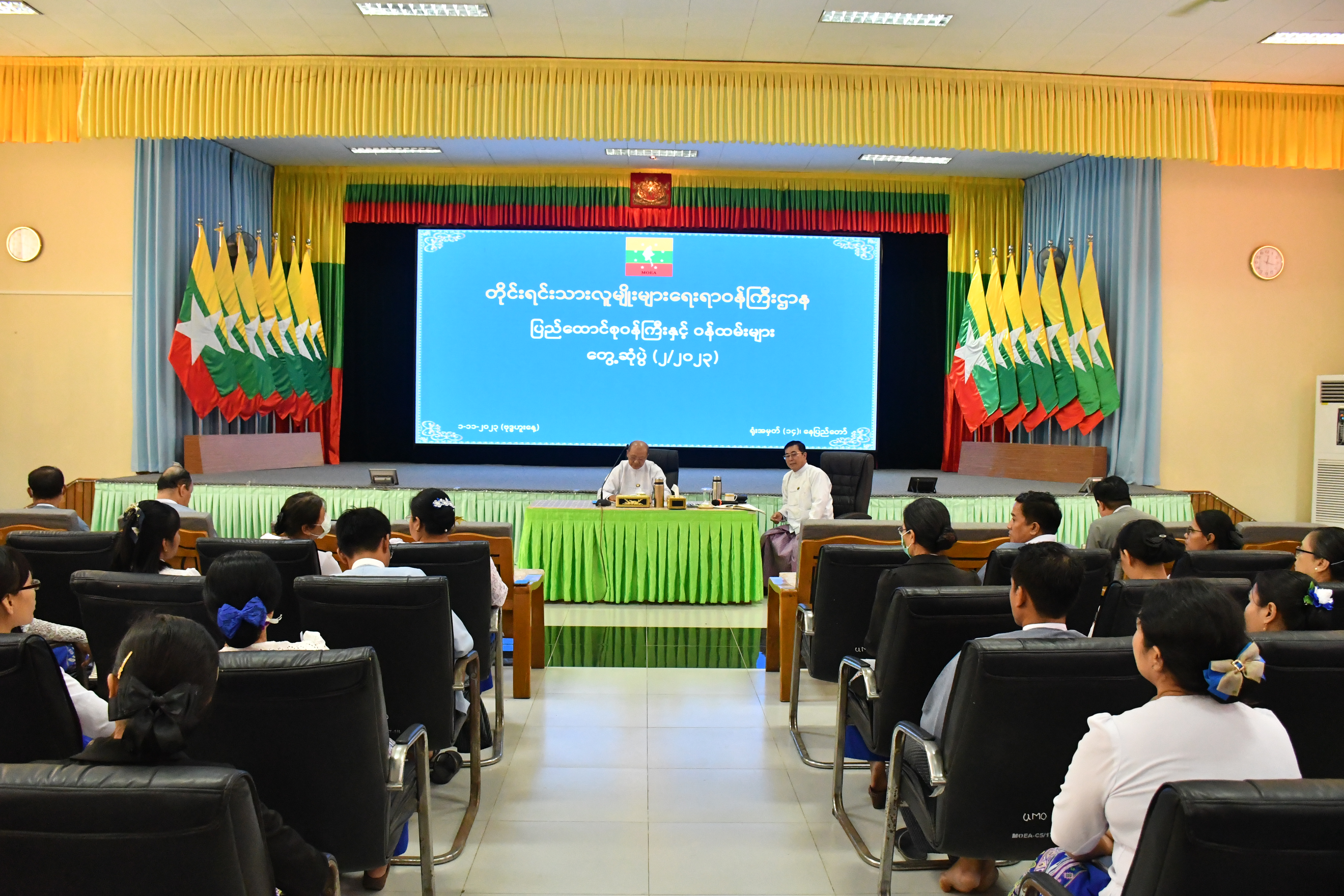 ဆက်လက်ဖတ်ရှုပါရန်တိုင်းရင်းသားလူမျိုးများရေးရာဝန်ကြီးဌာန ပြည်ထောင်စုဝန်ကြီးနှင့် အရာထမ်း၊ အမှုထမ်းများ တွေ့ဆုံပွဲ (၁/၂၀၂၃) ကို ယနေ့နံနက်ပိုင်းတွင် နေပြည်တော်ရှိ ပြည်ထောင်စု ဝန်ကြီးရုံး အစည်းအဝေးခန်းမ၌ ကျင်းပရာ တိုင်းရင်းသားလူမျိုးများရေးရာဝန်ကြီးဌာန၊ ပြည်ထောင်စုဝန်ကြီး Jeng Phang နော်တောင်၊ ဒုတိယဝန်ကြီး ဦးဇော်အေးမောင်၊ အမြဲတမ်းအတွင်းဝန်၊ ညွှန်ကြားရေးမှူးချုပ်များ၊ ဒုတိယအမြဲတမ်းအတွင်းဝန်၊ ဒုတိယ ညွှန်ကြားရေးမှူးချုပ်များနှင့် အရာထမ်း၊ အမှုထမ်းများ တက်ရောက်ခဲ့ကြပါသည်။ရှေးဦးစွာ ပြည်ထောင်စုဝန်ကြီး Jeng Phang နော်တောင်က အဖွင့်အမှာစကား ပြောကြားရာတွင် ဝန်ထမ်းအဖွဲ့အစည်းများတွင် အထက်အကြီးအကဲ အရာထမ်းများနှင့် အမှုထမ်း ဝန်ထမ်းများအားလုံး မျက်နှာချင်းဆိုင် ရင်းရင်းနှီးနှီးတွေ့ဆုံပြီး ရင်ဆိုင်တွေ့ကြုံနေ ရသည့် အခက်အခဲများကို ဝန်ထမ်း စည်းမျဉ်း စည်းကမ်းဘောင်အတွင်းမှ ဖြေရှင်းဆောင်ရွက် နိုင်ရန် ယခုတွေ့ဆုံပွဲကို ပြုလုပ်ရခြင်းဖြစ်ပါကြောင်း၊ ဝန်ကြီးဌာန၏ လုပ်ငန်းရည်မှန်းချက်မှာ သတ်မှတ်ပြဋ္ဌာန်းထားရှိသော ဥပဒေနှင့်အညီ တိုင်းရင်းသားများ၏ စာပေနှင့်ယဉ်ကျေးမှုများ ကို ထိန်းသိမ်းမြှင့်တင်ခြင်း၊ တိုင်းရင်းသားရေးရာများကို ဥပဒေနှင့်အညီ ကာကွယ်စောင့်ရှောက် ခြင်းနှင့် စစ်မှန်သော ပြည်ထောင်စုစိတ်ဓာတ် တိုးတက်ခိုင်မာစေပြီး တိုင်းရင်းသားများ၏ လူမှု စီးပွားဘဝမြင့်မားတိုးတက်စေရန် ဖြစ်ပါကြောင်း၊ ဝန်ထမ်းများအနေဖြင့် နိုင်ငံတော်စီမံ အုပ်ချုပ်ရေးကောင်စီ၏ ရှေ့လုပ်ငန်းစဉ် (၅) ရပ်၊ ဦးတည်ချက် (၉) ရပ်တို့နှင့်အညီ တိုင်းပြည်သာယာဝပြောရေး၊ အေးချမ်းတည်ငြိမ်ရေးနှင့် ငြိမ်းချမ်းရေးကို အထောက်အကူ ပြုစေရန် တိုင်းရင်းသားနှင့် နိုင်ငံ့ဝန်ထမ်းကောင်းများပီပီ ကျရာကဏ္ဍမှ အစွမ်းကုန်ကြိုးပမ်း ဆောင်ရွက်ကြရန်လိုအပ်မည် ဖြစ်ပါကြောင်း၊ ထို့အပြင် နိုင်ငံတော်မှ ပြဋ္ဌာန်းထားရှိသည့် ဥပဒေ၊ နည်းဥပဒေများ၊ နိုင်ငံ့ဝန်ထမ်းများ လိုက်နာရမည့် ကျင့်ဝတ် (၃၀) ပါးနှင့် နိုင်ငံ့ဝန်ထမ်း သစ္စာအဓိဋ္ဌာန် (၆) ချက်တို့ကို စောင့်ထိန်းလိုက်နာရန်နှင့် အထူးသဖြင့် ဝန်ထမ်းများအနေဖြင့် ပါတီနိုင်ငံရေး ကင်းရှင်းရန်လည်း လိုအပ်ပါကြောင်း၊ ဝန်ထမ်းရေးရာနှင့် ဌာနလုပ်ငန်းကိစ္စ ရပ်များ၊ အခက်အခဲနှင့် စိန်ခေါ်မှုများနှင့်ပတ်သက်၍ တင်ပြလိုသည်များကို ယနေ့တွေ့ဆုံပွဲတွင် ပွင့်လင်းစွာ တင်ပြကြရန်ဖြစ်ပါကြောင်း ပြောကြားပါသည်။ ထို့နောက် ဒုတိယဝန်ကြီးဦးဇော်အေးမောင်က မြန်မာ့ပထဝီနိုင်ငံရေး၊ ကမ္ဘာ့ပထဝီနိုင်ငံရေး နှင့်မြန်မာနိုင်ငံကြုံတွေ့ခဲ့ရသည့် သမိုင်းကြောင်းများကို ရှင်းလင်းဆွေးနွေးပြီး ယနေ့ခေ