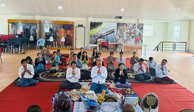 ရှမ်းပြည်နယ်အစိုးရအဖွဲ့ဝင် တိုင်းရင်းသားရေးရာဝန်ကြီး ဦးအောင်ကြည်ဝင်းနှင့် ရှမ်းပြည်နယ်ညွှန်ကြားရေးမှူးရုံးဝန်ထမ်းမိသားစုများ၏ ဒုတိယအကြိမ်ဝါဆိုသင်္ကန်းဆပ်ကပ် လှူဒါန်းပွဲ အခမ်းအနားကို တိုင်းရင်းသားလူမျိုးများရေးရာဝန်ကြီးဌာန၊ ရှမ်းပြည် နယ်ညွှန်ကြား ရေးမှူးရုံး အစည်းအဝေးခန်းမ၌ ၂၃-၈-၂၀၂၃ ရက်နေ့တွင် ကျင်းပပြုလုပ်ခဲ့ပါသည်။ရှေးဦးစွာ ရှမ်းပြည်နယ်အစိုးရအဖွဲ့ဝင် တိုင်းရင်းသားရေးရာဝန်ကြီးနှင့် ဧည့်ပရိသတ်များက တောင်ကြီးမြို့၊ ဘုရားကိုးဆူကျောင်းတိုက် ဆရာတော်အမှူးပြုသည့် ပင့်သံဃာ (၅) ပါးထံမှ ငါးပါး သီလခံယူဆောက်တည်ခြင်း၊ ပရိတ်တရားတော်နာယူခြင်း၊ ဆရာတော်သံဃာတော်များထံ ဝါဆို သင်္ကန်းနှင့် လှူဖွယ်ဝတ္ထုပစ္စည်းများ ဆက်ကပ်လှူဒါန်းခြင်းများ ပြုလုပ်ခဲ့ကြပါသည်။ဆက်လက်၍ ဝန်ကြီးနှင့် ဧည့်ပရိသတ်များက ဆရာတော်သံဃာတော်များထံမှ ရေစက်ချ အနုမောဒနာတရားများနာယူကာ ကောင်းမှုကုသိုလ်အစုစုတို့အတွက် ရေစက်သွန်းချ အမျှပေး ဝေခဲ့ကြပြီးနောက် ဆရာတော်သံဃာတော်များကို နေ့ဆွမ်းဆက်ကပ်လှူဒါန်းခဲ့ကြောင်း သိရှိရပါ သည်။