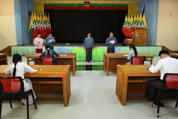 တိုင်းရင်းသားလူမျိုးများရေးရာဝန်ကြီးဌာန ဒုတိယဝန်ကြီး ဦးဇော်အေးမောင်၊ အမြဲတမ်းအတွင်းဝန်နှင့် ညွှန်ကြားရေးမှူးချုပ်တို့က ပြည်ထောင်စုဝန်ကြီးရုံးတွင် လစ်လပ်လျက်ရှိသည့် ဒုတိယဦးစီးမှူးအဆင့် ရာထူး (၁၁) နေရာအတွက် ရေးဖြေ စာမေးပွဲ ဖြေဆိုနေမှုအား ကြည့်ရှုစစ်ဆေးသည့် ဓာတ်ပုံမှတ်တမ်းများ