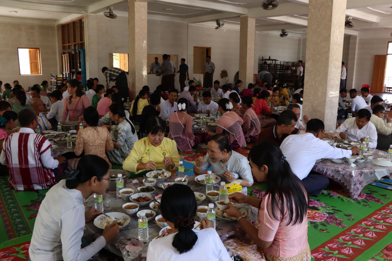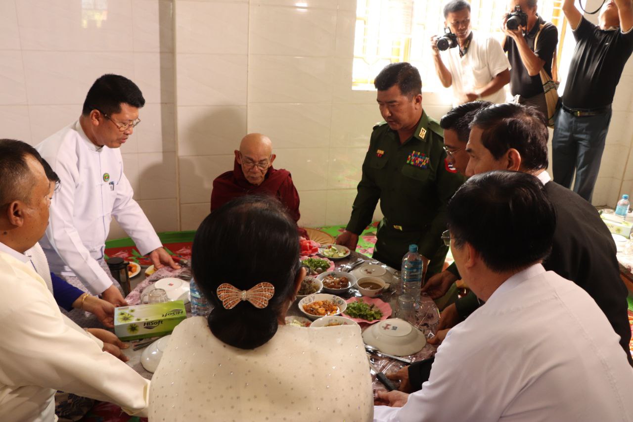 ထို့နောက် ဧရာဝတီတိုင်းဒေသကြီးအစိုးရအဖွဲ့၊ ဝန်ကြီးချုပ်နှင့်ဇနီးက ပင့်သံဃာ ဆရာတော် များအား နေ့ဆွမ်းဆက်ကပ်လှူဒါန်းခဲ့ပါသည်။ ဆက်လက်၍ အခမ်းအနား တက်ရောက်သူများအား နေ့လည်စာဖြင့် တည်ခင်းဧည့်ခံကျွေးမွေးခဲ့ကြောင်း သတင်းရရှိပါသည်။