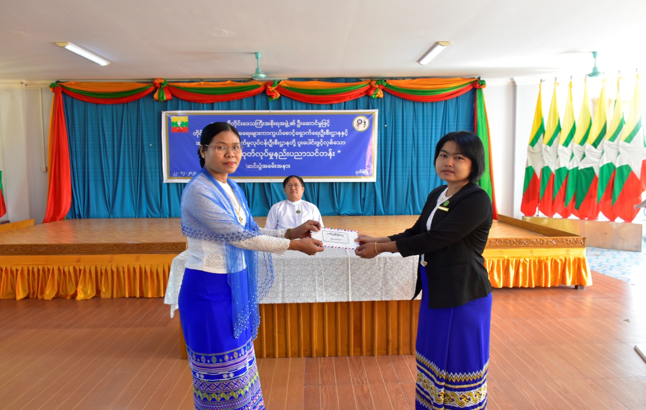 ဆက်လက်၍ တိုင်းရင်းသားရေးရာဝန်ကြီး ဦးစောလင်းခယ်က သင်တန်းတွင် ထူးချွန်ဆုရရှိသူ သင်တန်းသူများအား ဆုချီးမြှင့်ခြင်း၊ တိုင်းဒေသကြီးအသေးစားစက်မှုလက်မှုလုပ်ငန်းဦးစီးဌာန၊ ဒုတိယတိုင်းဦးစီးမှူး ဒေါ်မဉ္ဇူဝင်းက သင်တန်းဆင်းလက်မှတ်များပေးအပ်ခြင်းနှင့် တိုင်းရင်းသားအခွင့်အရေးများကာကွယ်စောင့်ရှောက်ရေးဦးစီးဌာန၊ ဧရာဝတီတိုင်းဒေသကြီး ညွှန်ကြားရေးမှူးရုံးမှ ဒုတိယညွှန်ကြားရေးမှူး ဒေါ်စန်းက သင်တန်းနည်းပြဆရာမများအား ဂုဏ်ပြုချီးမြှင့်ငွေနှင့် သင်တန်းသား၊ သင်တန်းသူများအား လူသုံးကုန်ပစ္စည်းများထောက်ပံ့ပေးအပ်ခြင်း အစီအစဉ်တို့ကို ဆောင်ရွက်ခဲ့ပါသည်။ ထို့နောက် သင်တန်းသူတစ်ဦးက ကျေးဇူး တင်စကားပြောကြားခဲ့ပြီး စုပေါင်းမှတ်တမ်းတင် ဓါတ်ပုံရိုက်ကူးကာ အခမ်းအနားကို ရုတ်သိမ်း ခဲ့ပါသည်။