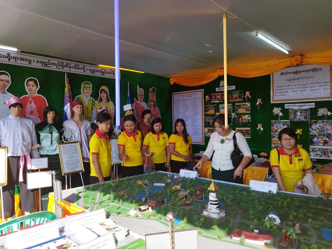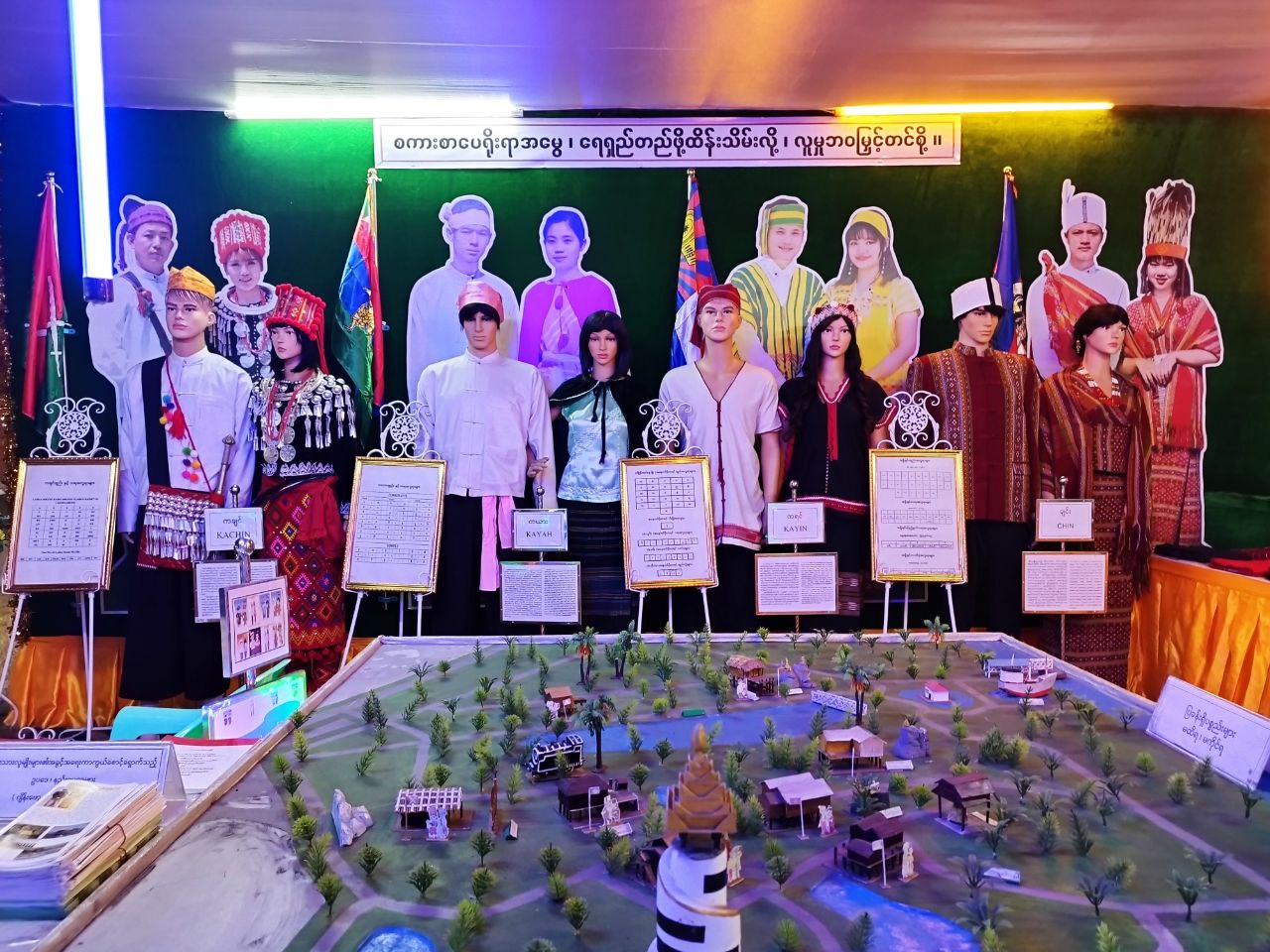 တိုင်းရင်းသားလူမျိုးများရေးရာဝန်ကြီးဌာနပြခန်းတွင် တိုင်းရင်းသားမျိုးနွယ်စုများကို ကိုယ်စား ပြုသည့် ကချင်၊ ကယား၊ ကရင်၊ ချင်း၊ ဗမာ၊ မွန်၊ ရခိုင်၊ ရှမ်း မျိုးနွယ်စုကြီး(၈)မျိုး၏ ရိုးရာ ဝတ်စားဆင်ယင်ထုံးဖွဲ့မှုနှင့် အဆိုပါမျိုးနွယ်စုများ၏ အခြေခံစာပေ (ဗျည်း၊ သရ)များအား ပြသခြင်း၊ တိုင်းရင်းသားမျိုးနွယ်စု ကိုယ်စားပြုအလံများ၊ ပြည်ထောင်စုတိုင်းရင်းသားကျေးရွာ(ရန်ကုန်) ပုံစံငယ် အားပြသခြင်း၊ တိုင်းရင်းသားများ၏ နေ့ထူးနေ့မြတ်အခမ်းအနား ဆောင်ရွက်မှုမှတ်တမ်းဓါတ်ပုံများ၊ ဝန်ကြီးဌာန၏ မျှော်မှန်းချက်(Vision) နှင့် ဦးစီးဌာန၏ ဆောင်ပုဒ်များ၊ မြန်မာနိုင်ငံရှိ တိုင်းရင်းသား မျိုးနွယ်စု (၁၃၅) မျိုးစာရင်းများ၊ တိုင်းဒေသကြီး နှင့် ပြည်နယ်အတွင်း တိုင်းရင်းသားဘာသာစာပေ သင်ကြားခွင့်ရရှိသည့် ဘာသာစာပေ(၇၂)မျိုးစာရင်းများ၊ တိုင်းရင်းသားလူမျိုးများ၏ အခွင့်အရေး ကာကွယ်စောင့်ရှောက်သည့် ဥပဒေ၊ နည်းဥပဒေ ဘာသာပြန်စာအုပ်များ၊ ဧရာဝတီတိုင်းဒေသကြီး အတွင်း သင်ကြားခွင့်ရရှိသည့် ပိုးကရင်၊ စကောကရင်၊ ရခိုင် နှင့် အရှိုချင်းတိုင်းရင်းသားဘာသာ ကျောင်းသုံးပုံနှိပ်စာအုပ်များ၊ တိုင်းရင်းသားလူမျိုးများ၏ နေ့ထူးနေ့မြတ် အကြောင်းအရာစာအုပ်များ၊ ပုံပြင်စာအုပ်များ၊ စကားထာစာအုပ်များ၊ စကားပုံ/ဆိုရိုးစာအုပ်များ နှင့် တိုင်းရင်းသားရိုးရာဝတ်စုံ များအား ခင်းကျင်းပြသဆောင်ရွက်ခဲ့ပြီး တိုင်းရင်းသားမျိုးနွယ်စုများအကြောင်းပါဝင်သည့် လက်ကမ်း စာစောင်များအား ဖြန့်ဝေပေးခဲ့ပါသည်။