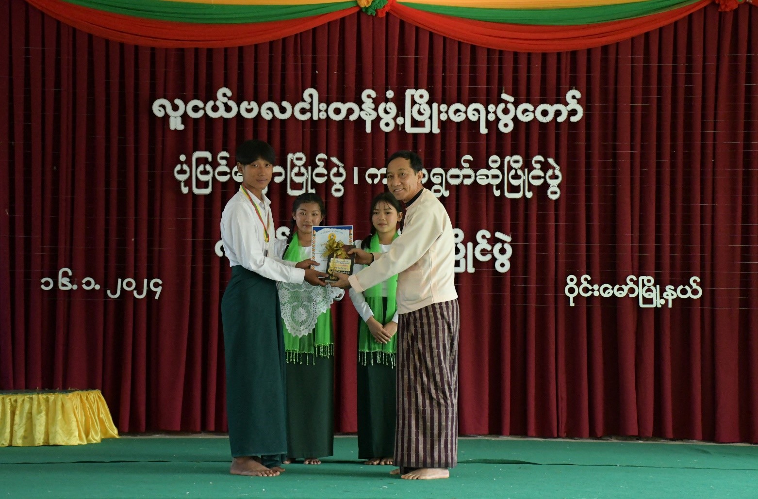 ယင်းနောက် ဆုများရရှိခဲ့ကြသော ပြိုင်ပွဲဝင်ကျောင်းသား၊ ကျောင်းသူများအား မြို့နယ်စီမံ အုပ်ချုပ်ရေးကောင်စီအဖွဲ့ဝင် ဦးကြည်ထွန်း၊ တိုင်းရင်းသားစာပေနှင့်ယဉ် ကျေးမှုဦးစီးဌာနမှ ပြည်နယ် တာဝန်ခံ ဒေါ်အိအိအေး၊ ဦးစီးအရာရှိများဖြစ်ကြသည့် ဦးခင်မောင်ထွန်းနှင့် ဦးလှိုင်ဝင်းဟန်၊ အထက(၂) ကျောင်းအုပ်ဆရာမကြီး ဒေါ်မိုးမိုးကြည်၊ ကချင်ပြည်နယ်စာကြည့်တိုက်များဖောင်ဒေးရှင်း ဥက္ကဋ္ဌ၊ စာရေးဆရာ အကြီးကိုကို(ကသာ)နှင့် တာဝန်ရှိသူများက ဆုများ အသီးသီးချီးမြှင့်ပေးအပ်ကြသည်။