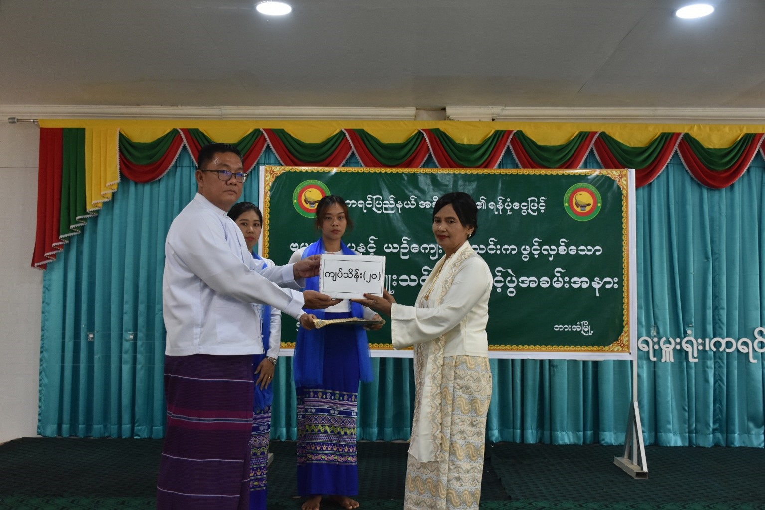 ဆက်လက်ပြီး ကရင်ပြည်နယ်အစိုးရအဖွဲ့ဝင် တိုင်းရင်းသားရေးရာဝန်ကြီး ဦးစန်းကိုမှ ထောက်ပံ့ချီးမြှင့်ငွေကျပ်သိန်း(၂၀)တိတိအား ပေးအပ်ခဲ့ပြီး သင်တန်းနည်းပြဆရာ Sunday Ko Ko (MRTV Presenter) အား အမှတ်တရလက်ဆောင်ချီးမြှင့်ခဲ့ပါသည်။ အဆိုပါသင်တန်းကို မတ်လ(၅)ရက်နေ့မှ (၇)ရက်နေ့အထိ ဖွင့်လှစ်မည်ဖြစ်ပြီး ဌာနဆိုင်ရာအသီးသီးနှင့် စာပေနှင့်ယဉ်ကျေးမှုအသင်းများမှ သင်တန်းသား၊ သင်တန်းသူ စုစုပေါင်း (၇၀)ဦးကျော် တက်ရောက်ခဲ့ကြောင်း သတင်းရရှိခဲ့ပါသည်။