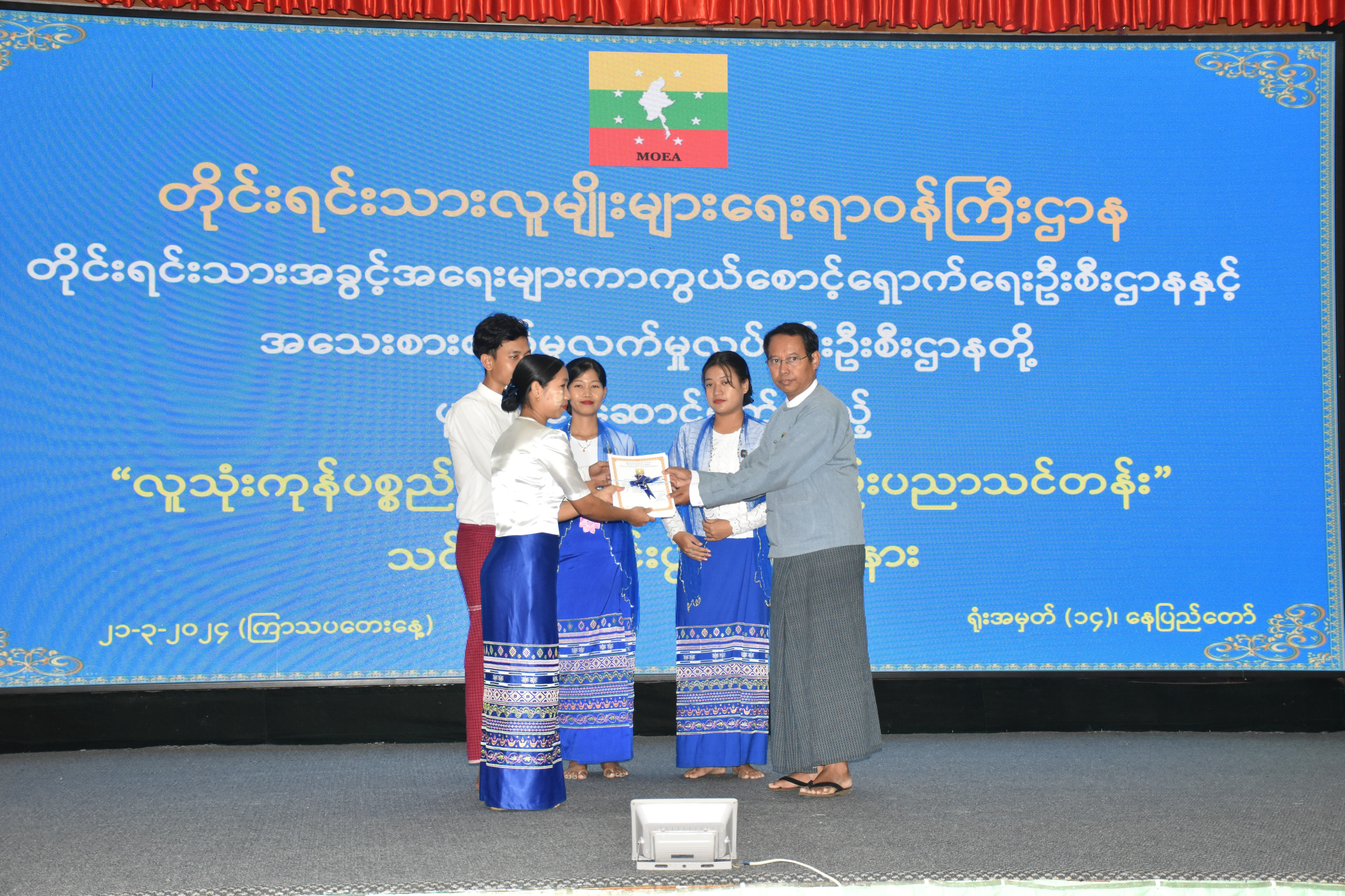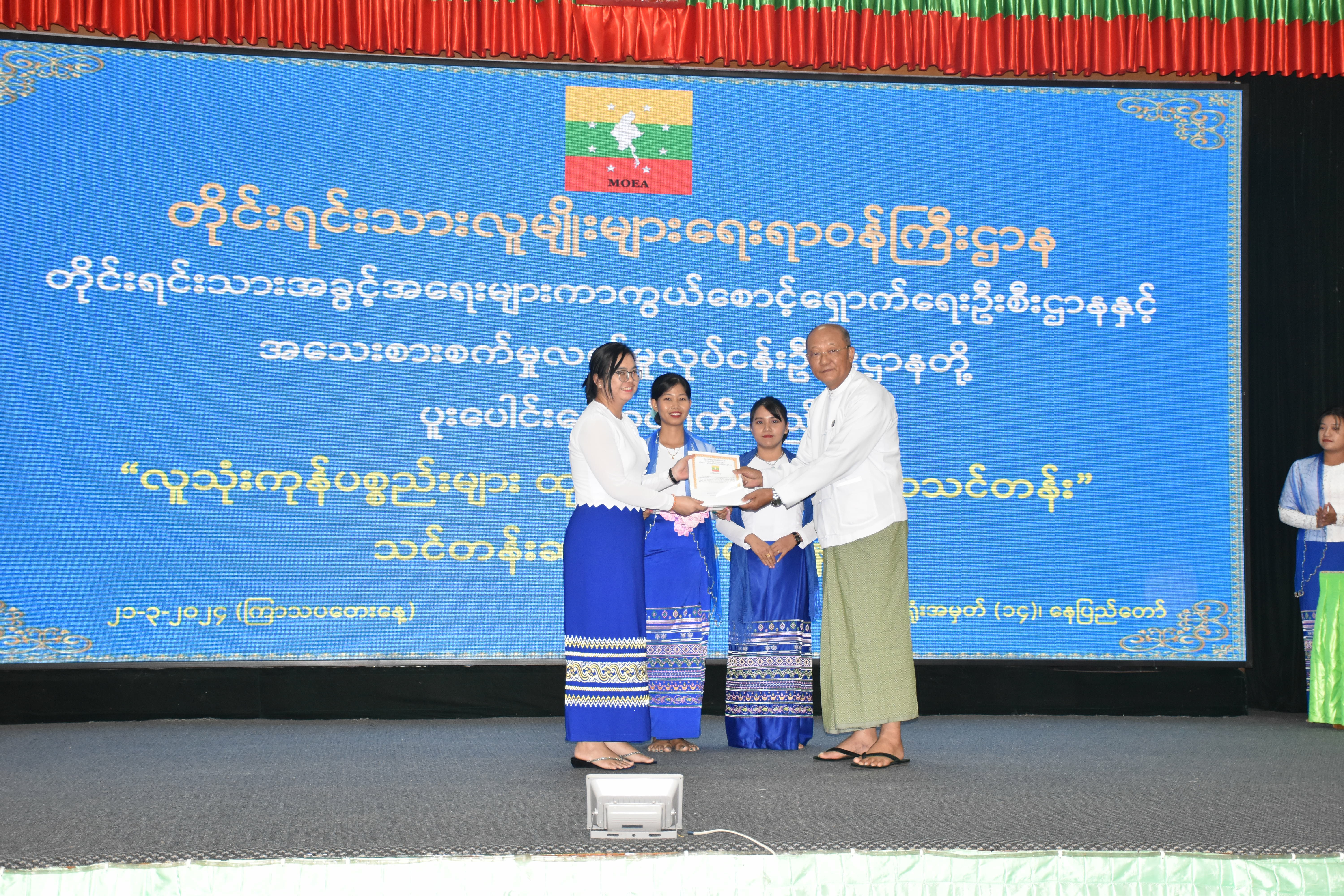 တိုင်းရင်းသားလူမျိုးများရေးရာဝန်ကြီးဌာနနှင့် သမဝါယမနှင့်ကျေးလက်ဖွံ့ဖြိုးရေးဝန်ကြီး ဌာနတို့ ပူးပေါင်း၍ ကျင်းပပြုလုပ်သည့် “လူသုံးကုန်ပစ္စည်းများထုတ်လုပ်မှု နည်းပညာသင်တန်း” ဆင်းပွဲအခမ်းအနားကို မတ်လ ၂၁ ရက်နေ့ မွန်းလွဲပိုင်းတွင် တိုင်းရင်းသားလူမျိုးများရေးရာ ဝန်ကြီးဌာန၊ အစည်းအဝေးခန်းမ၌ ကျင်းပရာ တိုင်းရင်းသားလူမျိုးများရေးရာဝန်ကြီးဌာန ပြည်ထောင်စုဝန်ကြီး Jeng Phang နော်တောင်၊ ဒုတိယဝန်ကြီး ဦးဇော်အေးမောင်၊ အမြဲတမ်း အတွင်းဝန်၊ ညွှန်ကြားရေးမှူးချုပ်များ၊ ဒုတိယညွှန်ကြားရေးမှူးချုပ်များ၊ အရာထမ်း၊ အမှုထမ်းများ၊ သင်တန်းနည်းပြများနှင့် သင်တန်းသား၊ သင်တန်းသူများ တက်ရောက်ကြပါသည်။