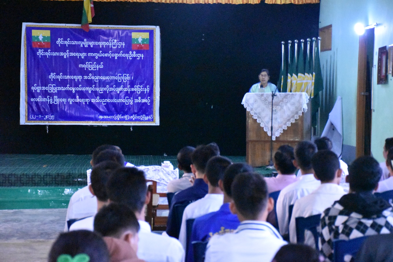 တိုင်းရင်းသားအခွင့်အရေးများကာကွယ်စောင့်ရှောက်ရေးဦးစီးဌာန၊ ကရင်ပြည်နယ် ညွှန်ကြားရေးမှူးရုံးကကြီးမှူး၍ တိုင်းရင်းသားရေးရာအသိပညာပေးခြင်း၊ ရပ်ရွာအခြေပြု အသက်မွေးဝမ်းကျောင်းပညာလိုအပ်ချက်တို့ကို ဆန်းစစ်စီမံခြင်းအစီအစဉ်နှင့် ဗလငါးတန်ဖွံ့ဖြိုးစေရေး လူငယ်ရေးရာအသိပညာပေးခြင်း အခမ်းအနားကို (၂၂-၁-၂၀၂၅) ရက်နေ့တွင် ကရင်ပြည်နယ်၊ လှိုင်းဘွဲ့မြို့၊ အခြေခံပညာအထက်တန်းကျောင်း(လှိုင်းဘွဲ့) ကျောင်းခန်းမ၌ ကျင်းပပြုလုပ်သည်။