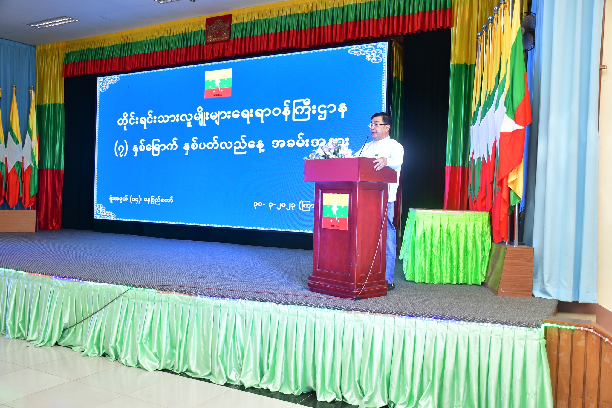 ထို့နောက် ဒုတိယဝန်ကြီးက အမှာစကားပြောကြားရာတွင် ၂၀၀၈ ခုနှစ် ဖွဲ့စည်းပုံအခြေခံ ဥပဒေ အခန်း(၁) အခြေခံမူအရ တိုင်းရင်းသားလူမျိုးများ၏ အခွင့်အရေးကာကွယ်စောင့်ရှောက် သည့်ဥပဒေ ပေါ်ပေါက်လာပါကြောင်း၊ ဥပဒေပါပြဋ္ဌာန်းချက်အရ တိုင်းရင်းသားလူမျိုးများရေးရာ ဝန်ကြီးဌာနဖြစ်ပေါ်လာပါကြောင်း၊ မိမိတို့ဝန်ကြီးဌာနသည် တိုင်းရင်းသားစာပေယဉ်ကျေးမှု ဖွံ့ဖြိုးတိုးတက်ရေးနှင့် တိုင်းရင်းသားများအခွင့်အရေးကာကွယ်စောင့်ရှောက်ရေးအတွက် အထူး တာဝန်ရှိသော ဌာနတစ်ခုဖြစ်ပါကြောင်း၊ မိမိတို့၏စွမ်းဆောင်ရည်(Capacity Building)ကို အစဉ်အမြဲ မြှင့်တင်နေရန်လိုပါကြောင်း၊ နိုင်ငံ့ဝန်ထမ်းများ ထမ်းဆောင်ရမည့်တာဝန် (၃) ရပ် ရှိပါကြောင်း၊ နိုင်ငံ့ဝန်ထမ်းကျင့်ဝတ် (၃၀) ပါး ရှိပါကြောင်း၊ ထိုကျင့်ဝတ်နှင့်တာဝန်များကို လိုက်နာကျင့်သုံးရမည်ဖြစ်ပါကြောင်း၊ ဝန်ထမ်းကောင်းမှ နိုင်ငံကောင်းမည်ဖြစ်ပါကြောင်း၊ ဝန်ထမ်းများ၏စွမ်းဆောင်ရည်မြင့်မားမှ ဝန်ကြီးဌာန၏ စွမ်းဆောင်ရည်လည်း မြင့်မားမည် ဖြစ်ပြီး တိုင်းရင်းသားစည်းလုံးညီညွှတ်မှုရရှိရေးနှင့် ပြည်ထောင်စုစိတ်ဓာတ်မြှင့်တင်ရေးကို အထောက်အကူ ဖြစ်မည်ဖြစ်ပါကြောင်း ပြောကြားခဲ့ပါသည်။
