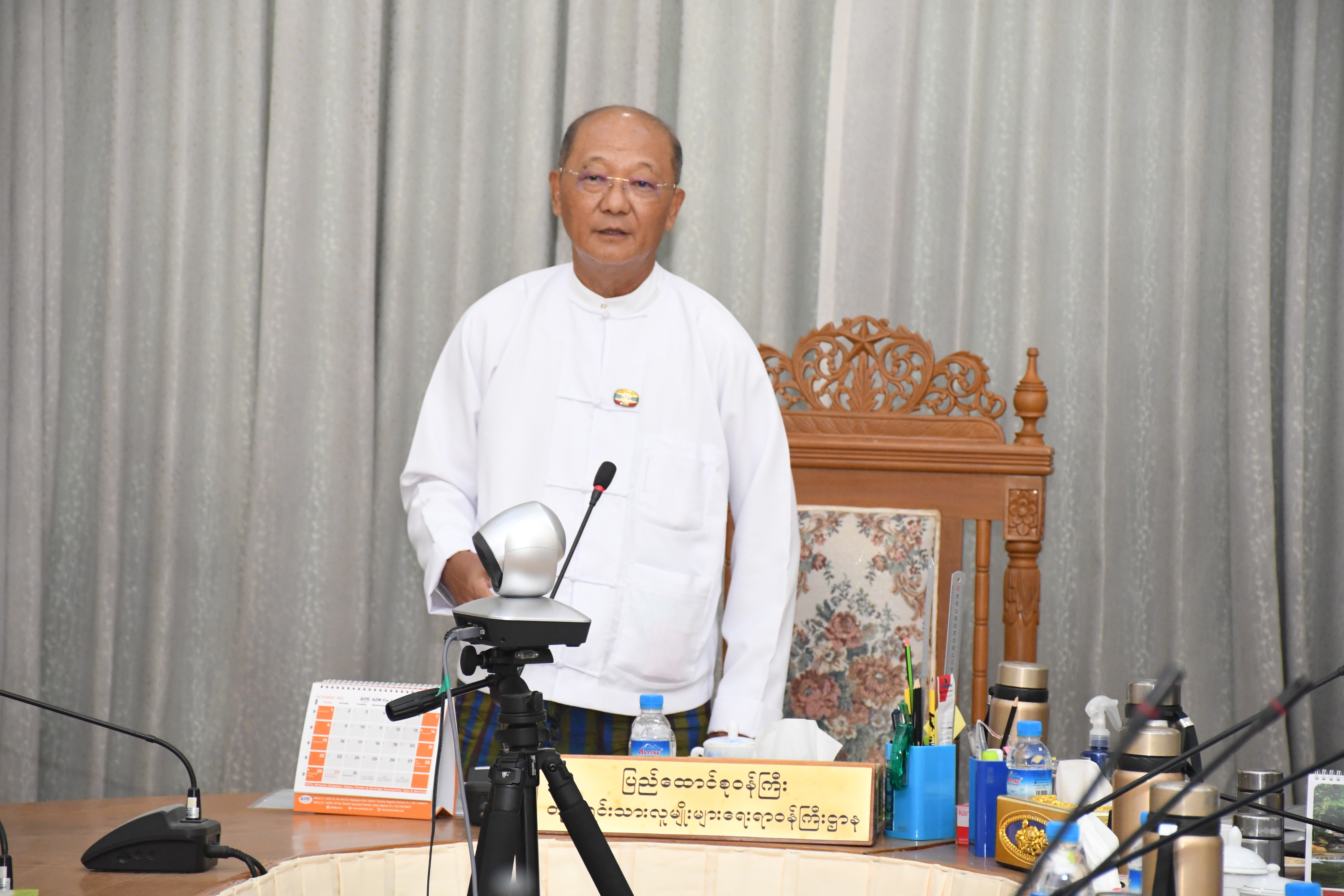 ဦးစွာ ပြည်ထောင်စုဝန်ကြီးက အဖွင့်အမှာစကားပြောကြားရာတွင် ၂၀၂၃-၂၀၂၄ ဘဏ္ဍာရေးနှစ် အမျိုးသားစီမံကိန်းဥပဒေကို တိုင်းပြည်သာယာဝပြောရေးနှင့် စားရေရိက္ခာဖူလုံရေးတို့အတွက် ပြည်သူ့လူမှုစီးပွားဘဝ ဖွံ့ဖြိုးတိုးတက်ရန်နှင့် ပြည်သူကို ဗဟိုပြု၍ အားလုံးပါဝင်နိုင်သော ရေရှည်ဖွံ့ဖြိုးတိုးတက်မှု ရရှိစေရန် ရည်ရွယ်၍ ချမှတ်ထားသည့် နိုင်ငံတော်၏ ရှေ့လုပ်ငန်းစဉ် ၅ ရပ်၊ ဦးတည်ချက် ၁၂ ရပ် နှင့်အညီ စနစ်တကျအကောင်အထည် ဖော်နိုင်ရန်အလို့ငှာ နိုင်ငံတော် စီမံအုပ်ချုပ်ရေးကောင်စီသည် ပြည်ထောင်စုသမ္မတမြန်မာနိုင်ငံတော် ဖွဲ့စည်းပုံအခြေခံဥပဒေ ပုဒ်မ ၄၁၉ အရ ပြဌာန်းခြင်းဖြစ်ပါကြောင်း၊ အမျိုးသားစီမံကိန်းဆိုသည်မှာ တစ်မျိုးသားလုံး၏ လူမှုစီးပွားရေးတစ်ရပ်လုံးအတွက်ဖြစ်စေ၊ သတ်မှတ်ထားသည့် အချိန်ကာလအတွင်း မည်၍ မည်မျှ တိုးတက်ရမည်ဆိုသည့် နိုင်ငံတော်၏ ရည်မှန်းချက်များနှင့် လုပ်ငန်းအစီအစဉ်များ ဖြစ်ပါကြောင်း၊ “ရှေ့သို့ချီမည် ပန်းတိုင်ဆီ” ဟူသည့် နိုင်ငံတော်အကြီးအကဲ၏ လမ်းညွှန်ချက် နှင့်အညီ မိမိတို့ဝန်ကြီးဌာနအနေဖြင့် အစွမ်းကုန် အားထည့်၍ လက်တွေ့ကျကျ အကောင်အထည်ဖော် ဆောင်ရွက်ကြရန်ဖြစ်ပါကြောင်း၊ ၂၀၂၃-၂၀၂၄ ဘဏ္ဍာရေးနှစ်အတွက် မိမိတို့ဝန်ကြီးဌာနမှ စီမံကိန်းလုပ်ငန်းစဉ် (၂၄) ခု တင်ပြခဲ့ပြီး ရငွေအနေဖြင့် (၁၀၇၀.၅၇၈) သန်း နှင့်သုံးငွေအနေဖြင့် (၅၄၁၃.၇၀၉) သန်း ကို နိုင်ငံတော်မှ အတည်ပြုပေးခဲ့ပြီးဖြစ်ပါကြောင်း၊ ၂၀၂၃ ခုနှစ်၊ ဧပြီလ ၃ ရက်နေ့တွင် နိုင်ငံတော်စီမံအုပ်ချုပ်ရေး ကောင်စီဥက္ကဋ္ဌ ကိုယ်တိုင် လက်မှတ်ရေးထိုးပြီး ဘဏ္ဍာရေးဆိုင်ရာ အရအသုံးများကို လုပ်ပိုင်ခွင့်အပ်နှင်းပေးခဲ့ပြီး ပြည်ထောင်စုဝန်ကြီးကိုယ်တိုင် စီမံကြည့်ရှုကွပ်ကဲရန်၊ ရရှိလာသည့် ဘဏ္ဍာငွေများကို ဘဏ္ဍာရေး ဆိုင်ရာ စည်းမျဉ်း၊ စည်းကမ်းများ၊ လုပ်ထုံးလုပ်နည်းများ၊ အမိန့်နှင့်ညွှန်ကြားချက်များနှင့်အညီ သုံးစွဲရန်၊ (၃) လတစ်ကြိမ် စနစ်တကျ ပြန်လည်အစီရင်ခံ တင်ပြရန် လမ်းညွှန်ထားပါကြောင်း၊ သို့ဖြစ်ရာ သက်ဆိုင်ရာဌာနများအလိုက် ငွေကြေးကိစ္စရပ်များကို လွှဲအပ်ပေးပြီးဖြစ်ပါကြောင်း၊ အထူးသဖြင့် ရငွေများကို ပိုမိုရှာဖွေရန်ဖြစ်ပြီး သုံးငွေများကို ချွေတာသုံးစွဲရန်ဖြစ်ပါကြောင်း၊ ရုံးလုပ်ငန်းဆောင်ရွက်ရာတွင် ပင်မအဖွဲ့အစည်းနှင့် အထောက်အကူပြု အဖွဲ့အစည်းဟူ၍ ရှိပါကြောင်း၊ အဆိုပါစီမံကိန်းများ အကောင်အထည်ဖော် ဆောင်ရွက်နိုင်ရေးအတွက် လူ့စွမ်းအားအရင်းအမြစ်၊ ဘဏ္ဍာငွေ၊ လုပ်ငန်းစွမ်းဆောင်နိုင်မှုအင်အားနှင့် အချိန်ကာလတို့ကို စနစ်တကျအသုံးချပြီး အချင်းချင်း အပြန်အလှန် တိုင်တိုင်ပင်ပင် ပူးပေါင်းဆောင်ရွက်သွားမည် ဆိုပါက အခက်အခဲမရ