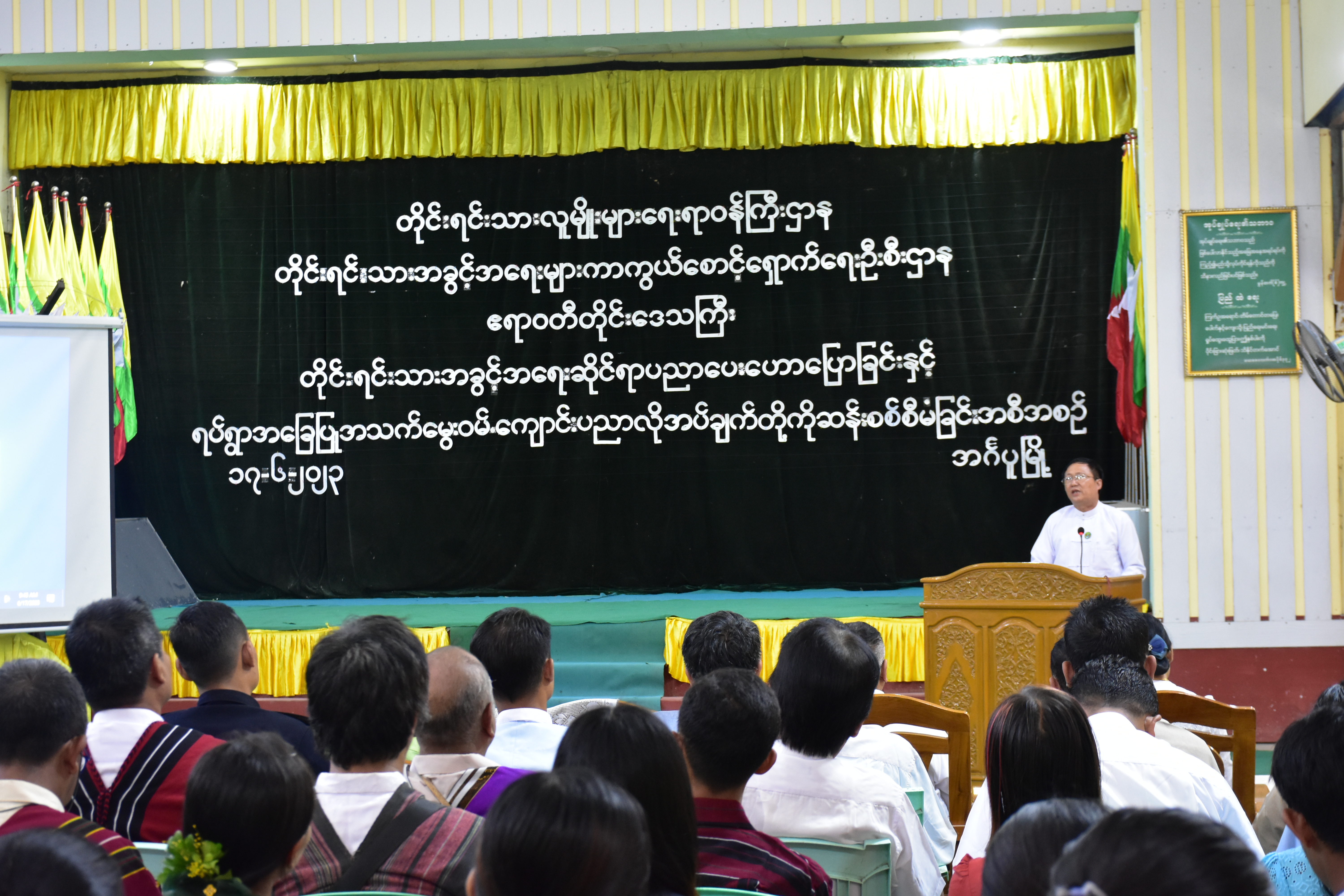 ဆက်လက်ဖတ်ရှုပါရန်တိုင်းရင်းသားအခွင့်အရေးဆိုင်ရာ အသိပညာပေးဟောပြောခြင်းနှင့် ရပ်ရွာအခြေပြု အသက်မွေး ဝမ်းကျောင်းပညာ လိုအပ်ချက်တို့ကို ဆန်းစစ်စီမံခြင်းအစီအစဉ်နှင့် ဆပ်ပြာရည်၊ ခေါင်းလျှော်ရည်၊ ဆပ်ပြာခဲ၊ လက်သန့်ဆေးရည် လူသုံးကုန် ထုတ်လုပ်မှုနည်းပညာသင်တန်းဖွင့်ပွဲအခမ်းအနား ရန်ကုန်တိုင်းဒေသကြီးတွင် ကျင်းပပြုလုပ် ရန်ကုန်၊ မေလ (၂၄)ရန်ကုန်တိုင်းဒေသကြီးအစိုးရအဖွဲ့၊ တိုင်းရင်းသားရေးရာဝန်ကြီး၏ ဦးဆောင်မှုဖြင့် တိုင်းရင်းသားအခွင့်အရေးများကာကွယ်စောင့်ရှောက်ရေးဦးစီးဌာနနှင့် အသေးစားစက်မှုလက်မှု ဦးစီးဌာနတို့ပူးပေါင်း၍ “တိုင်းရင်းသားအခွင့်အရေးဆိုင်ရာ အသိပညာပေးဟောပြောခြင်းနှင့် ရပ်ရွာအခြေပြုအသက်မွေးဝမ်းကျောင်းပညာလိုအပ်ချက်တို့ကိုဆန်းစစ်စီမံခြင်းအစီအစဉ်” နှင့် “ဆပ်ပြာရည်၊ ခေါင်းလျှော်ရည်၊ ဆပ်ပြာခဲ၊လက်သန့်ဆေးရည် လူသုံးကုန်ထုတ်လုပ်မှု နည်းပညာ သင်တန်းဖွင့်ပွဲအခမ်းအနား”ကို (၂၄-၅-၂၀၂၃) ရက်နေ့ နံနက် (၉:၀၀) နာရီအချိန်တွင် ရန်ကုန် တိုင်းဒေသကြီး၊ မှော်ဘီမြို့နယ်၊ ကင်မလင်းချောင်းကျေးရွာ၊ ဓမ္မာရုံ၌ ကျင်းပပြုလုပ်ခဲ့ပါသည်။ အခမ်းအနားသို့ ရန်ကုန်တိုင်းဒေသကြီး အစိုးရအဖွဲ့ဝင်၊ တိုင်းရင်းသားရေးရာဝန်ကြီး ဦးစောဂျက်ကော့ထူး၊ ရန်ကုန်တိုင်းဒေသကြီး၊ ညွှန်ကြားရေးမှူးရုံး၊ တိုင်းရင်းသားစာပေနှင့် ယဉ်ကျေးမှုဦးစီးဌာနမှ ညွှန်ကြားရေးမှူး၊ ဦးပြေဟိန်းနိုင်၊ တိုင်းရင်းသားအခွင့်အရေးများကာကွယ် စောင့်ရှောက်ရေးဦးစီးဌာနမှ ဒုတိယညွှန်ကြားရေးမှူး ဒေါ်ဖြူဖြူဝင်းနှင့် အရာထမ်း၊ အမှုထမ်းများ၊ လူဝင်မှုကြီးကြပ်ရေးနှင့်ပြည်သူ့အင်အားဦးစီးဌာနမှ မြောက်ပိုင်းခရိုင်မှူး ဒေါ်ဥမ္မာညွန့်၊ မှော်ဘီခရိုင် အုပ်ချုပ်ရေးမှူး ဦးမြင့်နိုင်၊ ခရိုင်လူမှုဝန်ထမ်းဦးစီးဌာနမှ လက်ထောက်ညွှန်ကြားရေးမှူး ဒေါ်ခင်စန်းမြင့်၊ မှော်ဘီမြို့နယ်စီမံအုပ်ချုပ်ရေးကောင်စီအဖွဲ့ဝင်(၂)ဦး၊ မှော်ဘီမြို့နယ်အုပ်ချုပ် ရေးမှူး၊ အသေးစားစက်မှုလက်မှုဦးစီးဌာနမှ လက်ထောက်ညွှန်ကြားရေးမှူး ဦးရဲဇော်ထွန်း၊ သမဝါယမဦးစီးဌာနမှ မြို့နယ်ဦးစီးမှူး ဦးကျော်သူစိုး၊ တိုက်ကြီးမြို့နယ် စီမံအုပ်ချုပ်ရေးအဖွဲ့ဝင် များ၊ ရန်ကုန်တိုင်းဒေသကြီး ကရင်စာပေနှင့်ယဉ်ကျေးမှုအသင်းမှဥက္ကဋ္ဌ၊ အတွင်းရေးမှူးနှင့် တာဝန်ရှိသူများ၊ မှော်ဘီမြို့နယ်အတွင်းရှိ ဒေသခံတိုင်းရင်းသားများ အပါအဝင် စုစုပေါင်း( ၁၂၀ ) ဦး တက်ရောက်ခဲ့ကြပါသည်။ ပထမဦးစွာ ရန်ကုန်တိုင်းဒေသကြီး တိုင်းရင်းသားရေးရာဝန်ကြီး ဦးစောဂျက်ကော့ထူးမှ အဖွင့်အမှာစကားပြောကြားခဲ့ပြီး တိုင်းရင်းသားစာပေနှင့်ယဉ်ကျေးမှုဦးစီးဌာန၊ ညွှန်ကြားရေးမှူး ဦးပြေဟိန်းနိုင်မှ