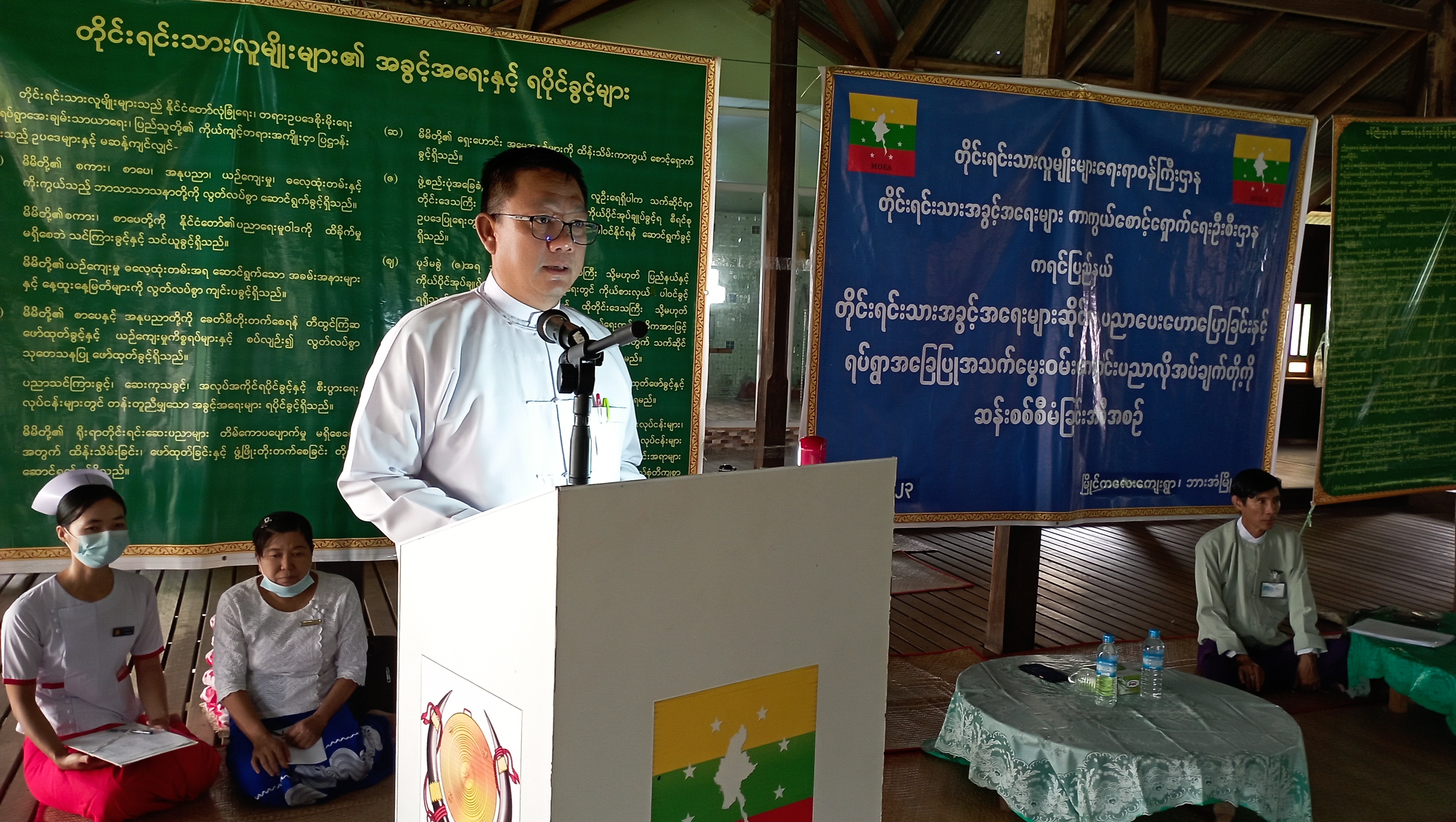 ကရင်ပြည်နယ်အစိုးရအဖွဲ့၊ တိုင်းရင်းသားရေးရာဝန်ကြီး ဦးဆောင်မှုဖြင့် တိုင်းရင်းသား အခွင့်အရေးများကာကွယ်စောင့်ရှောက်ရေးဦးစီးဌာန၊ ကရင်ပြည်နယ် ညွှန်ကြားရေးမှူးရုံးက “တိုင်းရင်းသားအခွင့်အရေးဆိုင်ရာ ပညာပေးဟောပြောခြင်းနှင့် ရပ်ရွာအခြေပြုအသက်မွေးဝမ်း ကျောင်းပညာ လိုအပ်ချက်တို့ကို ဆန်းစစ်စီမံခြင်း အစီအစဉ်” ကို ၂၀၂၃ ခုနှစ်၊ မေလ (၂၆)ရက်နေ့ တွင် ကရင်ပြည်နယ်၊ ဘားအံမြို့နယ်၊ ရသဝေါ်ကျေးရွာ၊ သာနုံးတိုက်ကျောင်း၊ ဓမ္မာရုံတွင် ပြုလုပ် ခဲ့ရာ အခမ်းအနားသို့ ကရင်ပြည်နယ်အစိုးရအဖွဲ့၊ တိုင်းရင်းသားရေးရာဝန်ကြီး ဦးစန်းကို၊ ဘားအံ မြို့နယ် စီမံအုပ်ချုပ်ရေးကောင်စီ အဖွဲ့ဝင်(၂)ဦးဝင်းတင်နှင့် ပြည်နယ်/ခရိုင်/မြို့နယ်အဆင့် ဌာန ဆိုင်ရာများမှ တာဝန်ရှိသူများ၊ ဖိတ်ကြားထားသော ဧည့်သည်များ၊ ကျေးရွာအုပ်ချုပ်ရေးမှူ များ၊ ဒေသခံတိုင်းရင်းသားများ စုစုပေါင်း (၉၇) ဦး တက်ရောက်ခဲ့ကြပါသည်။အခမ်းအနားတွင် ကရင်ပြည်နယ် တိုင်းရင်းသားရေးရာဝန်ကြီး ဦးစန်းကို က အဖွင့်အမှာ စကားပြောကြားခဲ့ပြီး တိုင်းရင်းသားအခွင့်အရေးများကာကွယ်စောင့်ရှောက်ရေးဦးစီးဌာန၊ ကရင် ပြည်နယ်၊ ညွှန်ကြားရေးမှူးရုံးမှ ဒုတိယညွှန်ကြားရေးမှူး၊ ဦးကျော်စိုးက တိုင်းရင်းသားလူမျိုးများ ၏အခွင့်အရေးကာကွယ်စောင့်ရှောက်သည့် ဥပဒေ၊ နည်းဥပဒေများနှင့် ဝန်ကြီးဌာန၏ ရှေ့လုပ်ငန်းစဉ်များအကြောင်းကို ရှင်းလင်းပြောကြားခဲ့ပါသည်။ဆက်လက်၍ ဘားအံမြို့နယ်စီမံအုပ်ချုပ်ရေးကောင်စီအဖွဲ့ အဖွဲ့ဝင်(၂)ဦးဝင်းတင်က တိုင်းရင်းသားကလေးငယ်များ ကျောင်းစတင်အပ်နှံချိန်တွင် မိမိတို့လူမျိုး၏ ဝိသေသရှေ့ဆောင် စကားလုံးများပါဝင်သည့် အမည်များဖြင့် ကျောင်းအမည်စာရင်းရေးသွင်းနိုင်ရေးနှင့် စပ်လျဉ်းသည့် ကိစ္စရပ်များ၊ ကျေးလက်ဒေသဆိုင်ရာဖွံ့ဖြိုးရေးလုပ်ငန်းများ ဆောင်ရွက်နေမှုများကိုလည်းကောင်း၊ တိုင်းရင်းသားစာပေနှင့်ယဉ်ကျေးမှုဦးစီးဌာန၊ ကရင်ပြည်နယ်၊ ညွှန်ကြားရေးမှူးရုံးမှ ဦးစီးအရာရှိ ဒေါ်မြတ်သီရိအောင်က တိုင်းရင်းသားစာပေနှင့်ယဉ်ကျေးမှု ထိန်းသိမ်းမှုဆိုင်ရာ ကိစ္စရပ်များ၊ တိုင်းရင်းသားစာပေသင်ကြားသည့် Teaching Assistant (TA) နှင့် Language Teacher (LT) ဆရာ/ဆရာမများ ခန့်ထားခြင်းဆိုင်ရာ ကိစ္စရပ်များ၊ တိုင်းရင်းသား ပွဲတော်များ ကျင်းပရေးအတွက် ပြည်နယ်အစိုးရအဖွဲ့၏ ထောက်ပံ့ကူညီပေးမှုများနှင့် တိုင်းရင်းသားဘာသာသင် ပုံပြ/ပုံပြင် စာအုပ် များဖြန့်ဝေခြင်းဆိုင်ရာ ကိစ္စရပ်များကိုလည်းကောင်း၊ ပြည်နယ်လူမှုဝန်ထမ်းဦးစီးဌာနမှ ဦးစီး အရာရှိ ဒေါ်စန်းစန်းလှိုင်က အမျိုးသမီးအခွင့်အရေး၊ ကလေးသူငယ်အခွင့်အရေး၊ မသန်စွမ်း အခွင့်အရေး၊ နိုင်ငံသားအခွင့်အရေး၊ လူမှုရေးပင်စင်၊ လူငယ်ရ