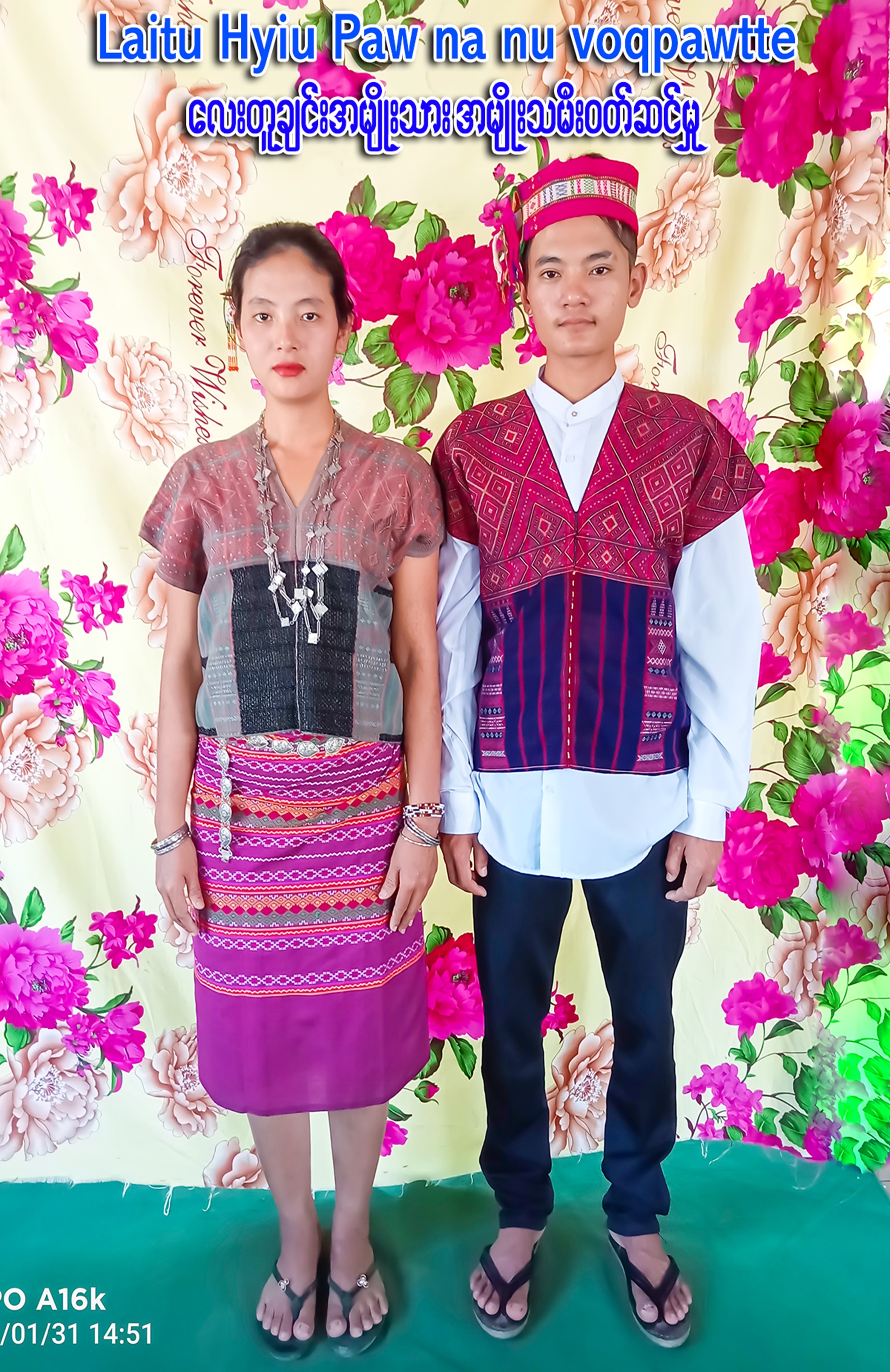 မိမိတို့ရိုးရာထုံးတမ်းစဉ်လာအရ ယောကျ်ားဝတ်ဆင်ပုံနှင့် မိန်းမ အဝတ်တန်ဆာ ဆင်ယင်ပုံရှိသည်။ ဓာတ်ပုံဖြင့်ပူးတွဲဖော်ပြပါသည်။