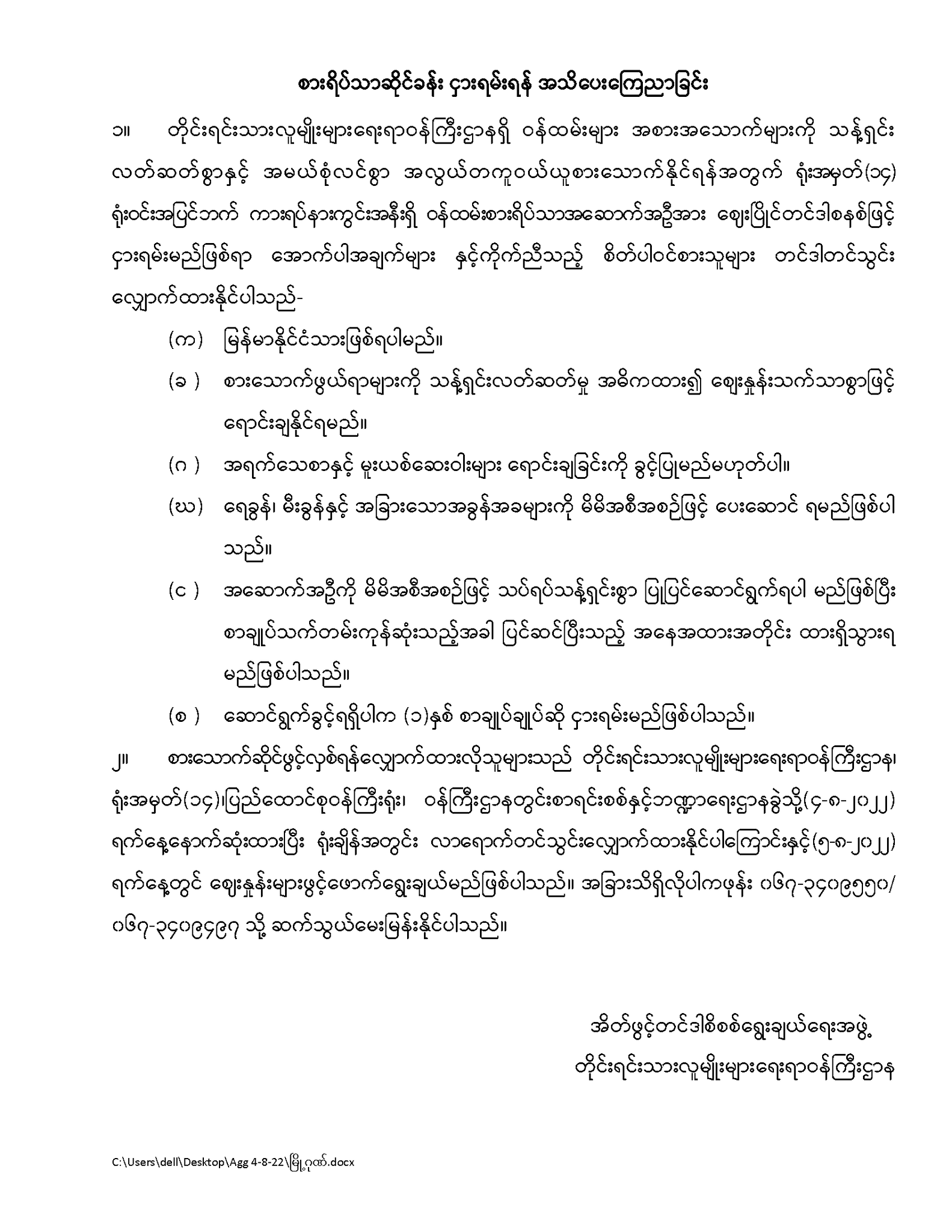 တိုင်းရင်းသားလူမျိုးများရေးရာဝန်ကြီးဌာန၊ တိုင်းရင်းသားအခွင့်အရေးများကာကွယ်စောင့်ရှောက်ရေးဦးစီးဌာန အိတ်ဖွင့်တင်ဒါခေါ်ယူခြင်း