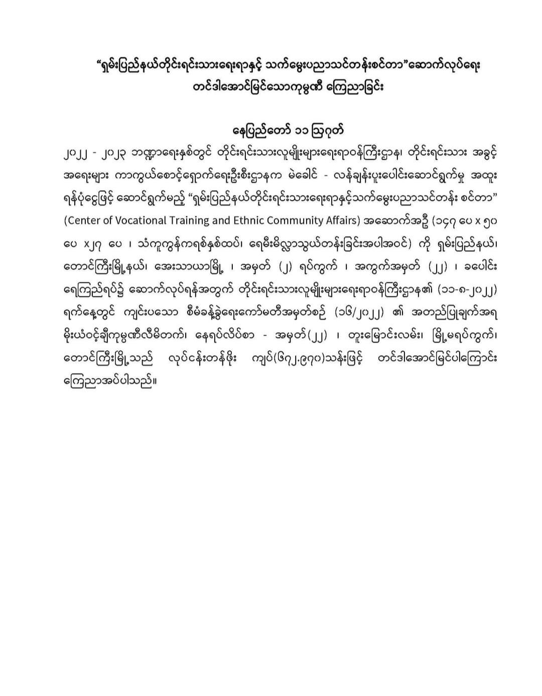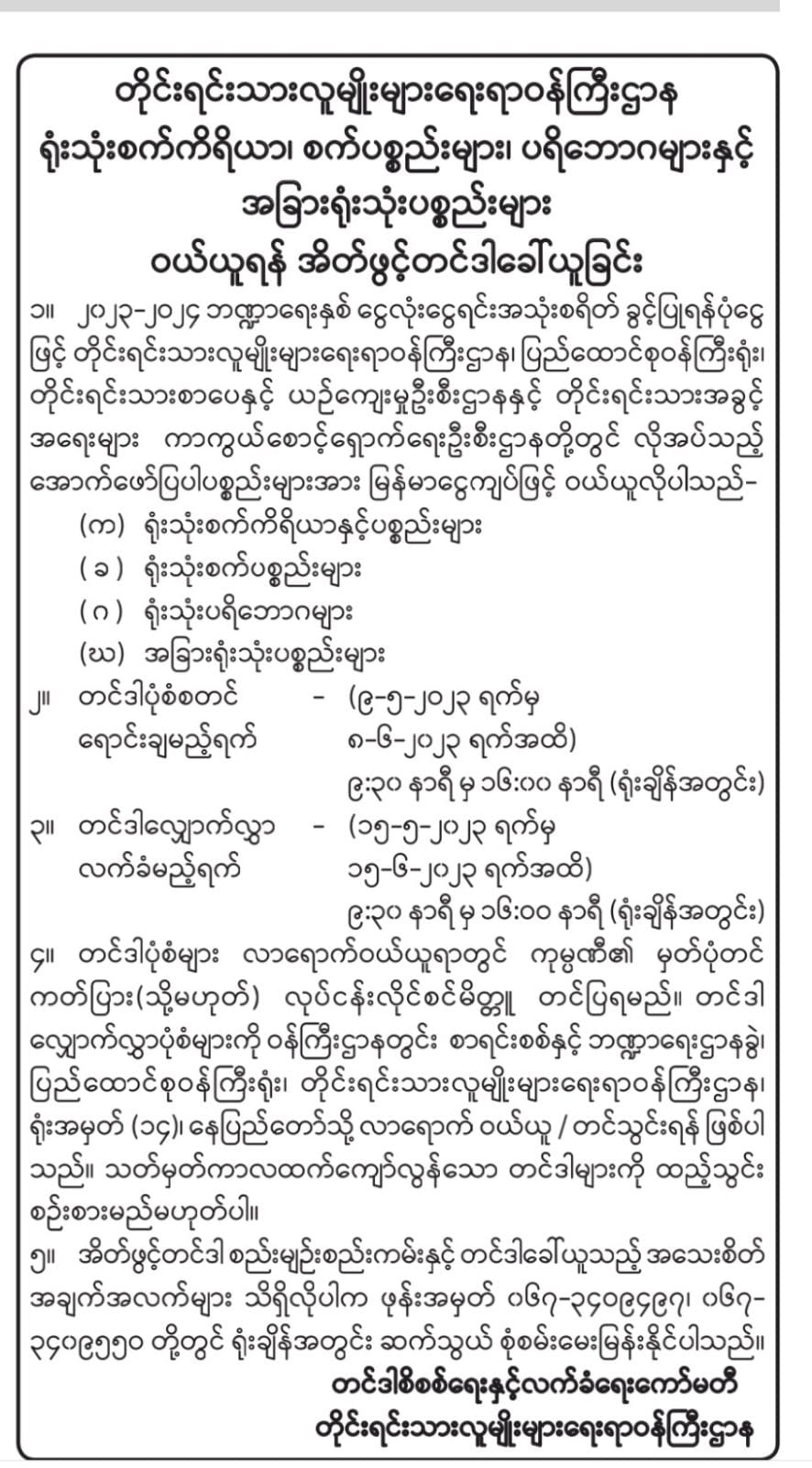 တိုင်းရင်းသားလူမျိုးများရေးရာဝန်ကြီးဌာန၊ တိုင်းရင်းသားစာပေနှင့်ယဉ်ကျေးမှုဦးစီးဌာန၏ တင်ဒါခေါ်ယူခြင်းနှင့် ဈေးနှုန်းအဆိုပြုလွှာ လျှောက်လွှာခေါ်ယူခြင်း