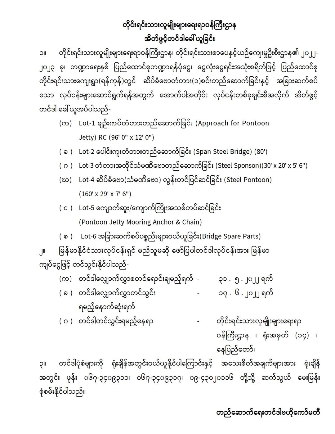 တိုင်းရင်းသားလူမျိုးများရေးရာဝန်ကြီးဌာန၊ တိုင်းရင်းသားစာပေနှင့်ယဉ်ကျေးမှုဦးစီးဌာန၏ ၂၀၂၂-၂၀၂၃ ခု၊ ဘဏ္ဍာရေးနှစ် ပြည်ထောင်စုဘဏ္ဍာရန်ပုံငွေ၊ ငွေလုံးငွေရင်းအသုံးစရိတ်ဖြင့် ပြည်ထောင်စု တိုင်းရင်းသားကျေးရွာ(ရန်ကုန်)တွင် ဆိပ်ခံဗောတံတား(၁)စင်းတည်ဆောက်ခြင်းနှင့် အခြားဆက်စပ်သော လုပ်ငန်းများဆောင်ရွက်ရန်အတွက် အိတ်ဖွင့်တင်ဒါခေါ်ယူခြင်း