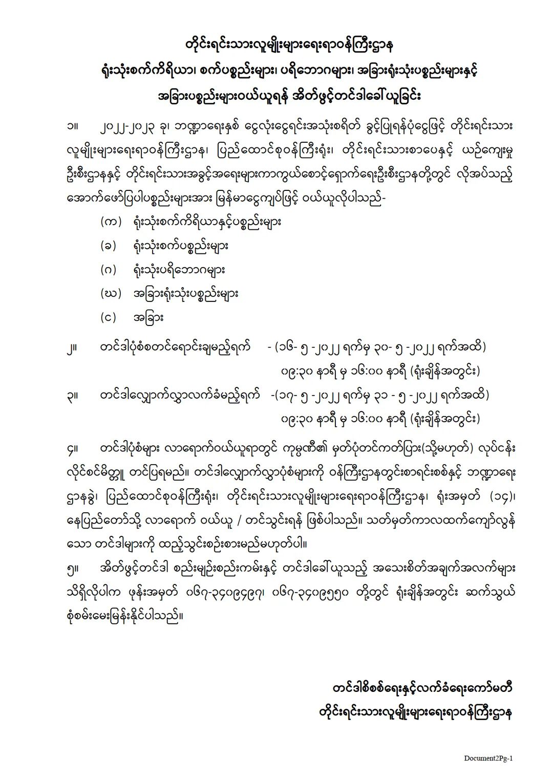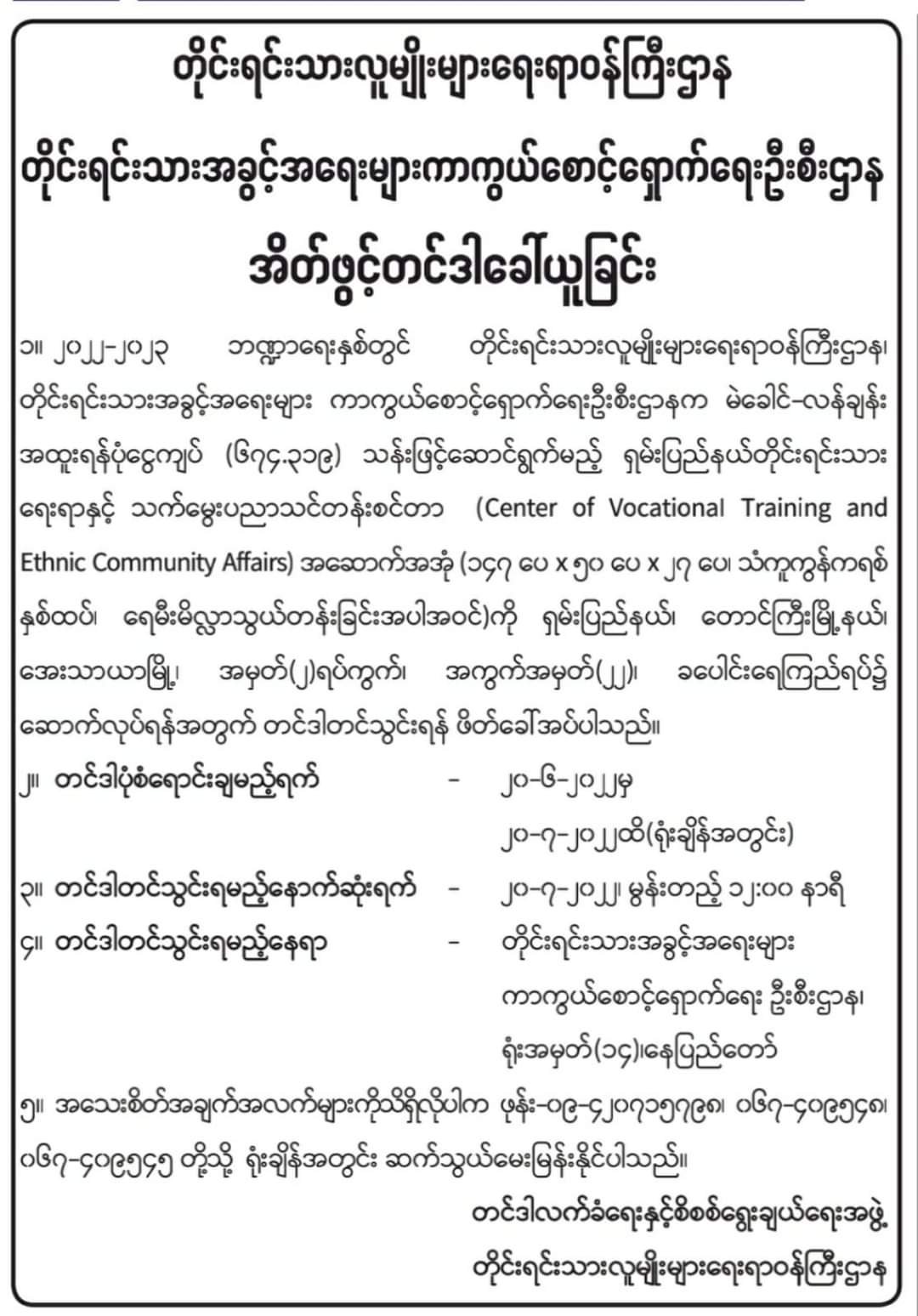 တိုင်းရင်းသားလူမျိုးများရေးရာဝန်ကြီးဌာန ရုံးသုံးစက်ကိရိယာ၊ စက်ပစ္စည်းများ၊ ပရိဘောဂများ၊ အခြားရုံးသုံးပစ္စည်းများနှင့် အခြားပစ္စည်းများဝယ်ယူရန် အိတ်ဖွင့်တင်ဒါခေါ်ယူခြင်း