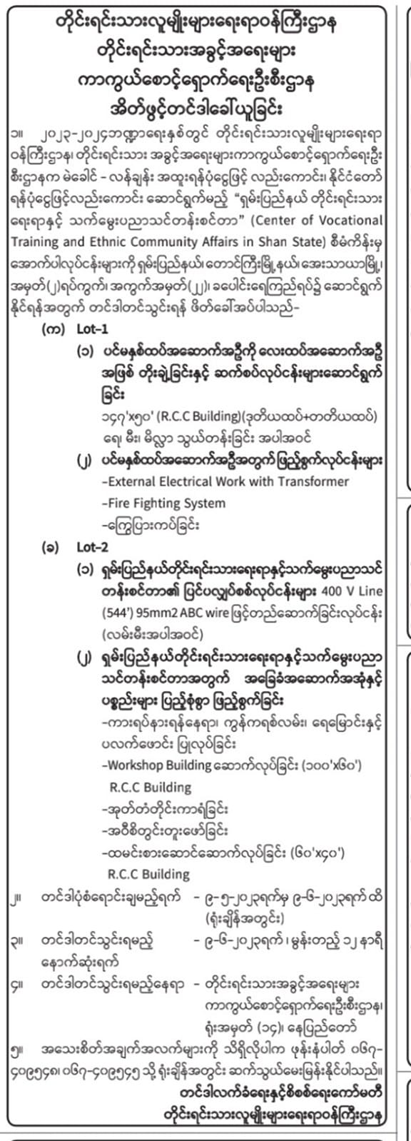 ရှမ်းပြည်နယ်တိုင်းရင်းသားရေးရာနှင့်သက်မွေးပညာသင်တန်းစင်တာစီမံကိန်းပါ ဆောက်လုပ်ရေးလုပ်ငန်းများအတွက် တင်ဒါအောင်မြင်သော ကုမ္ပဏီအား ကြေညာခြင်း နေပြည်တော်၊ ဇွန်လ (၂၆) ရက်